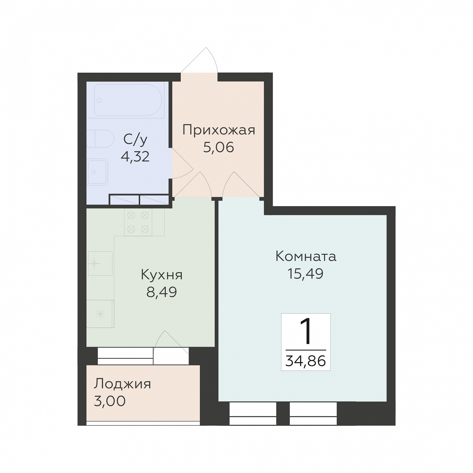 1-комнатная квартира, 34.86 м2, 11 этаж, №1 378, Домино