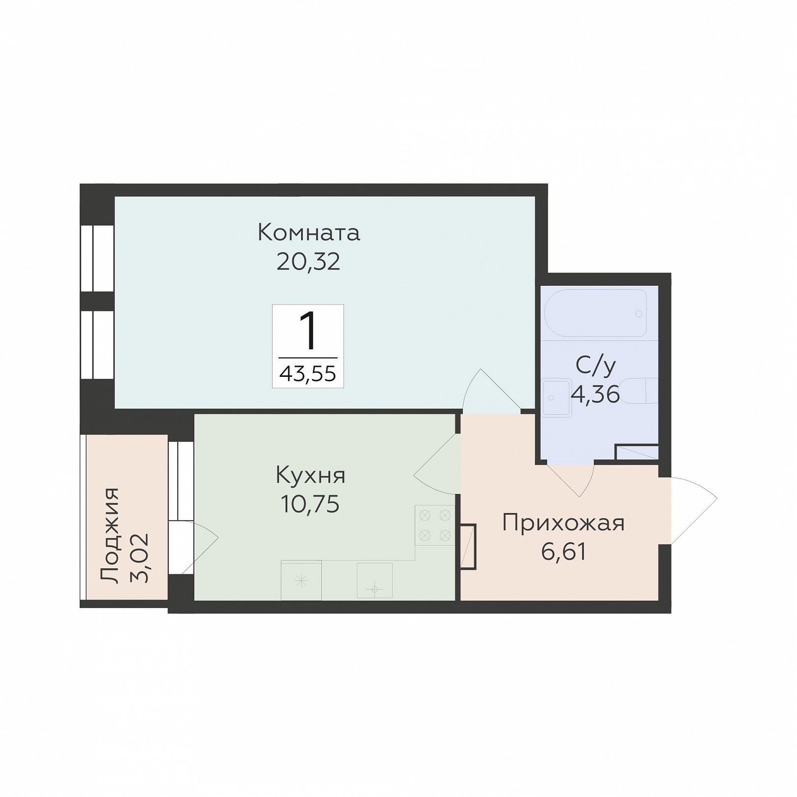 1-комнатная квартира, 43.55 м2, 11 этаж, №1 384, Домино