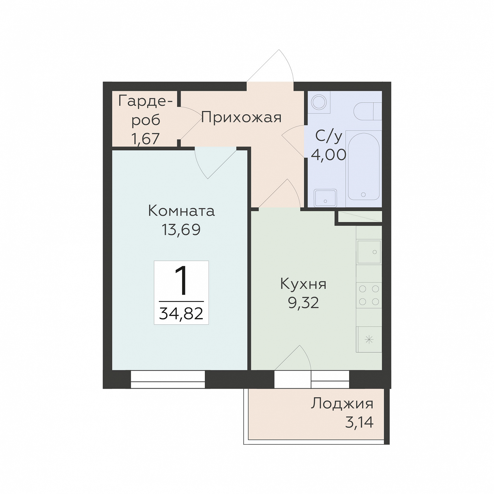 1-комнатная квартира, 34.82 м2, 13 этаж, №1 203, Домино