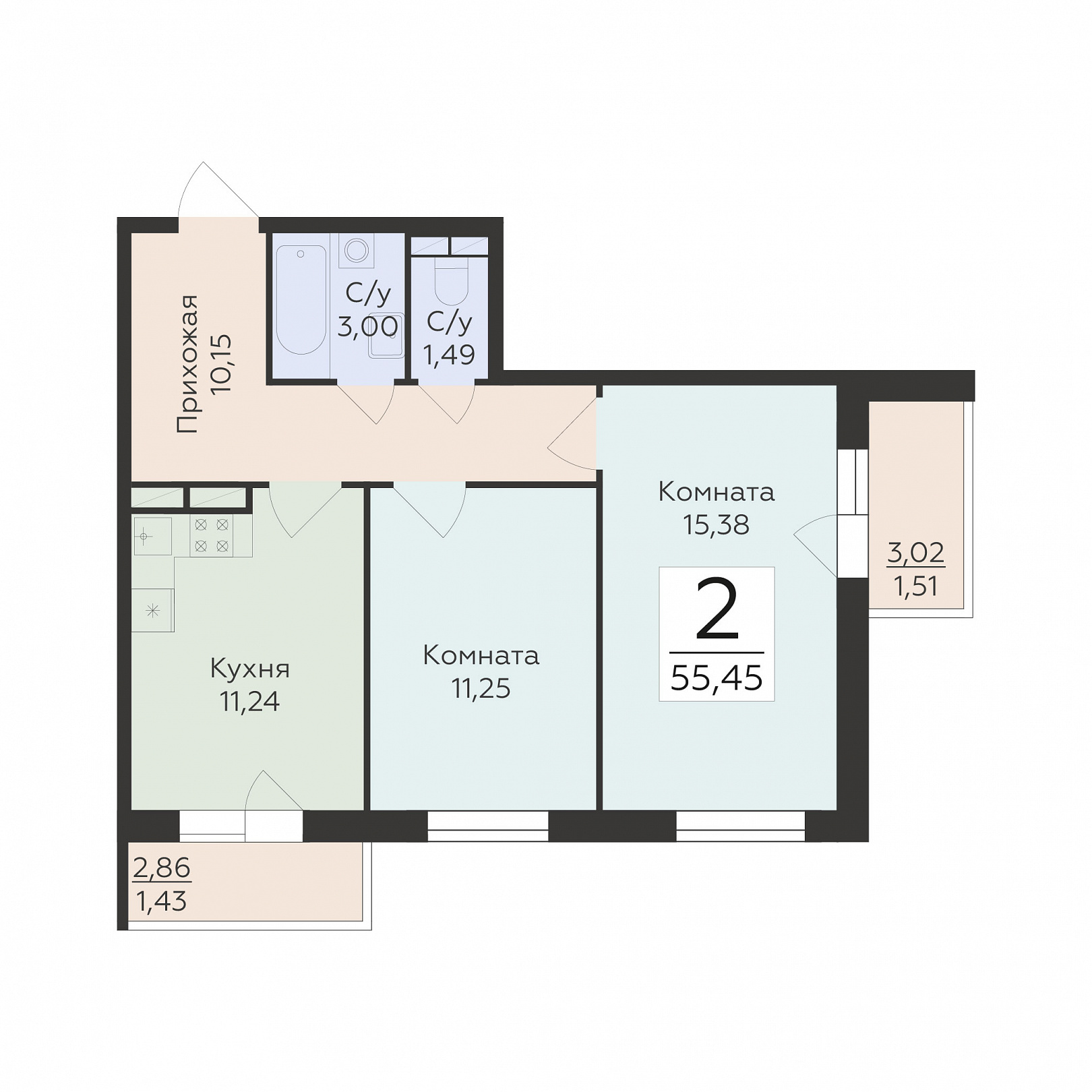 2-комнатная квартира, 55.45 м2, 5 этаж, №930, Домино
