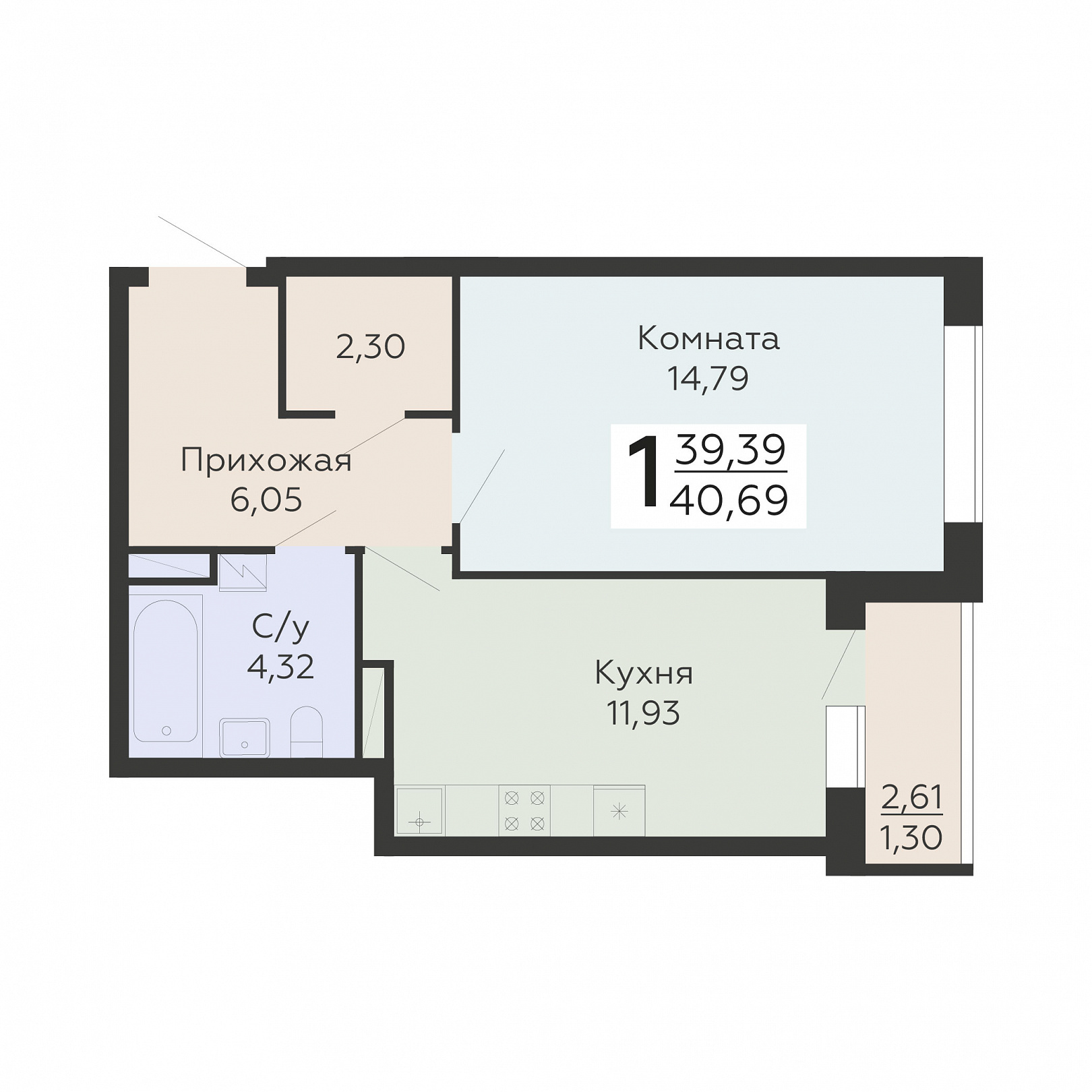 1-комнатная квартира, 40.69 м2, 5 этаж, №612, Никитинские сады