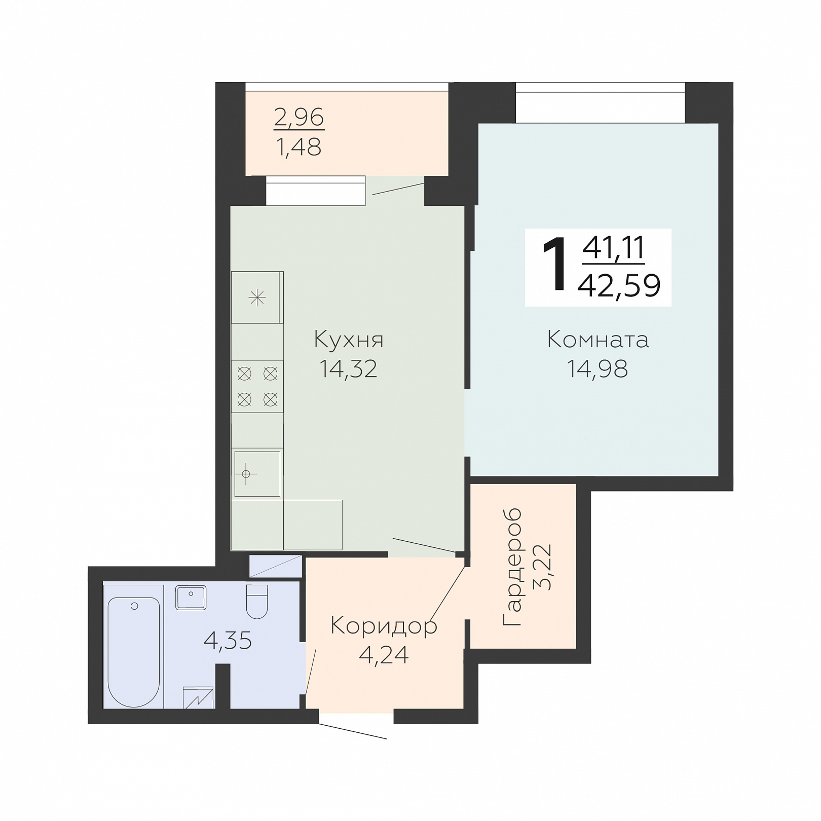 1-комнатная квартира, 42.59 м2, 13 этаж, №607, Зарядье