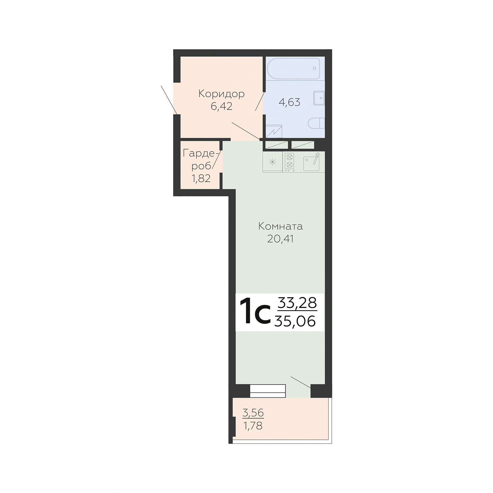 1-комнатная (студия), 35.06 м2, 5 этаж, №250, Зарядье