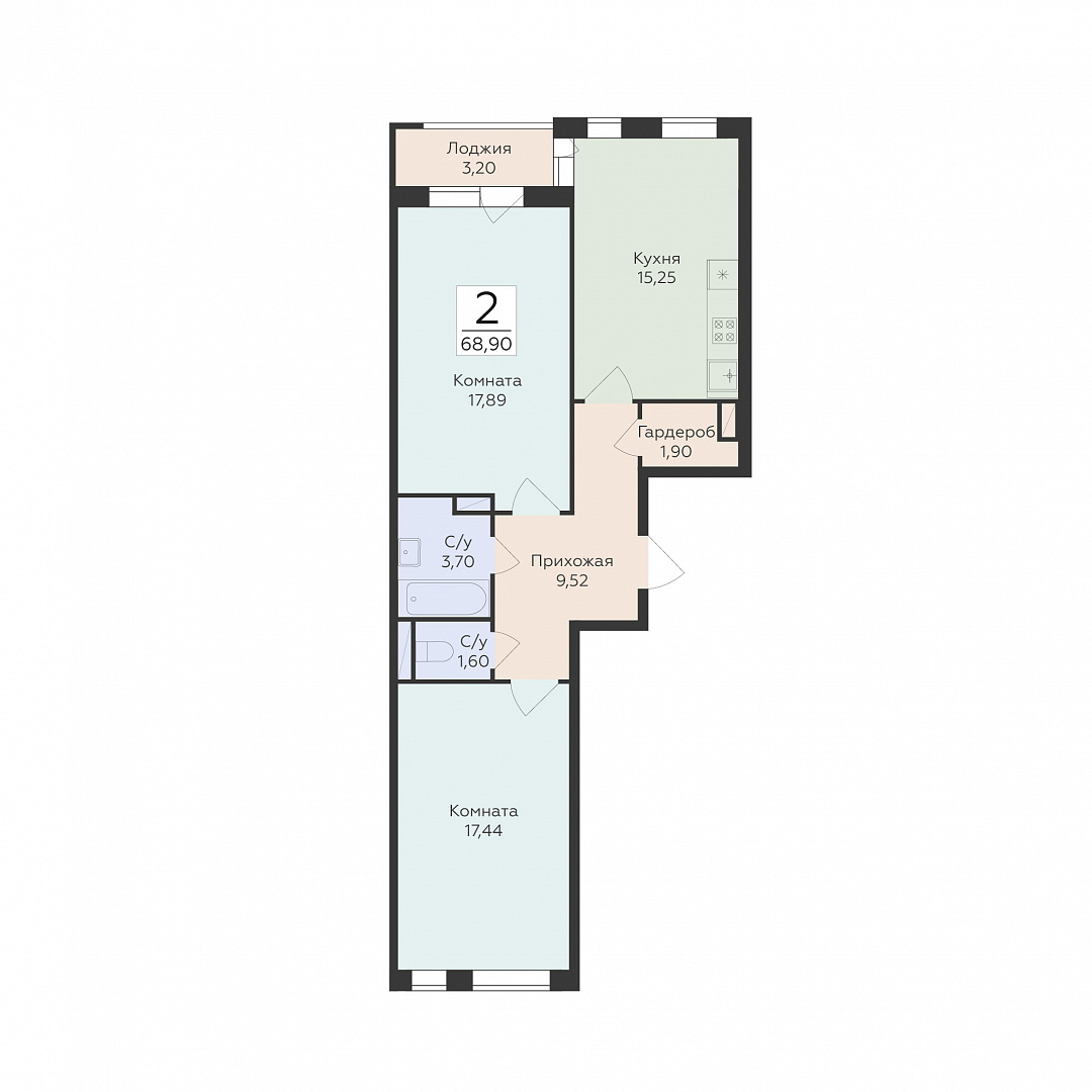 2-комнатная квартира, 68.9 м2, 18 этаж, №496, Квартал 45