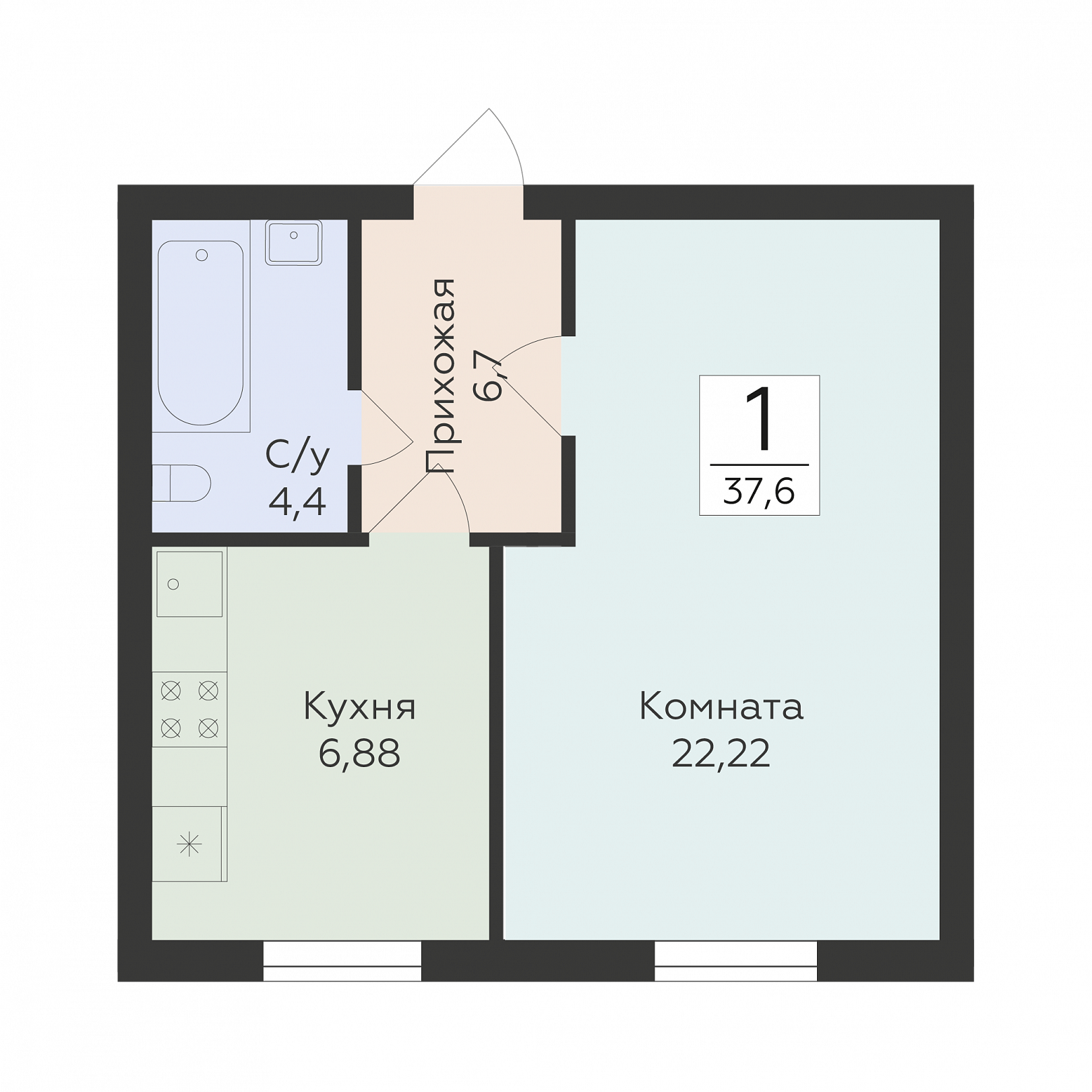 1-комнатная квартира, 37.6 м2, 1 этаж, №1, Классики