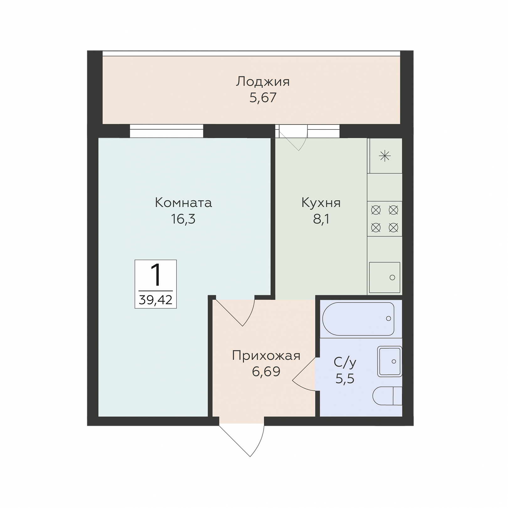 1-комнатная квартира, 39.42 м2, 14 этаж, №378, Классики