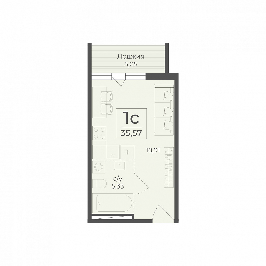 1-комнатная (студия), 35.57 м2, 5 этаж, №434, Botanica