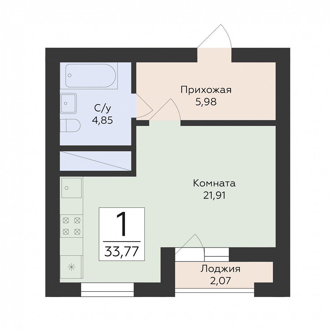 1-комнатная (студия), 33.77 м2, 2 этаж, №143, Юность