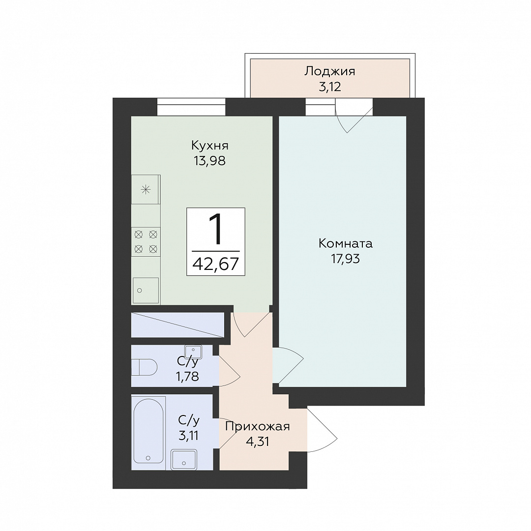 1-комнатная квартира, 42.67 м2, 2 этаж, №144, Юность
