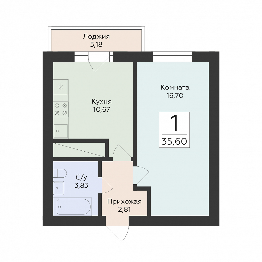 1-комнатная квартира, 35.6 м2, 1 этаж, №352, Юность