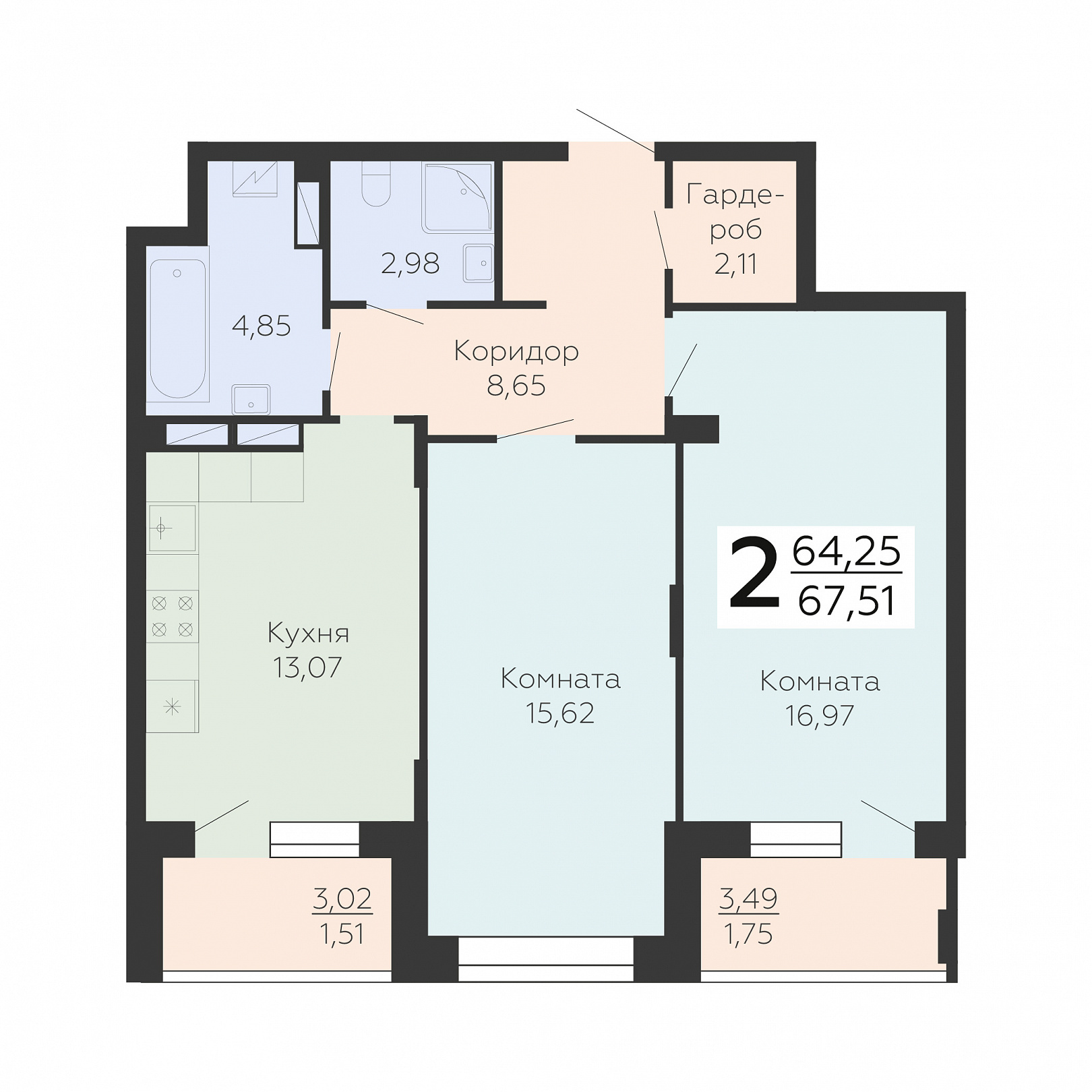 2-комнатная квартира, 67.51 м2, 10 этаж, №301, Зарядье