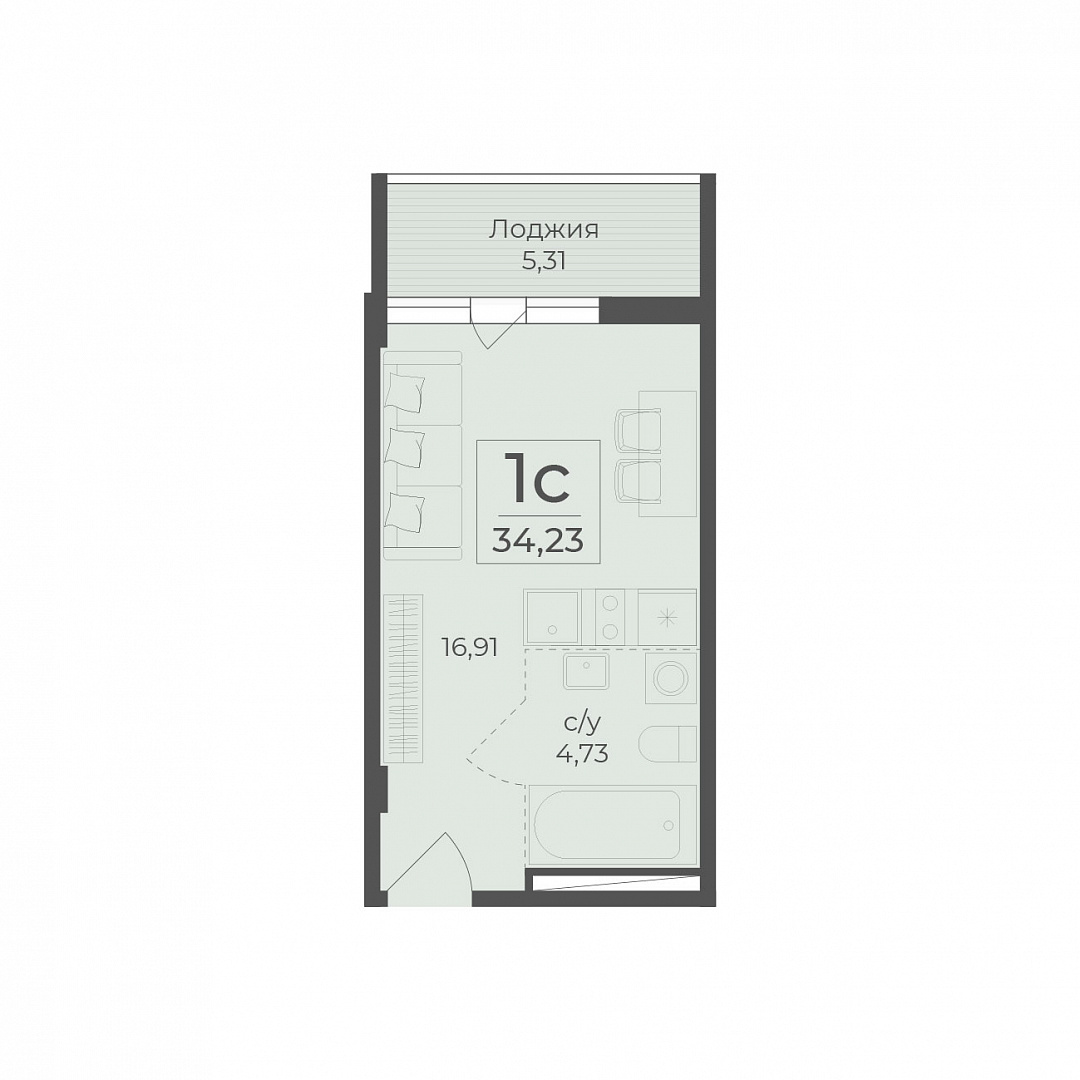 1-комнатная (студия), 34.23 м2, 7 этаж, №292, Botanica