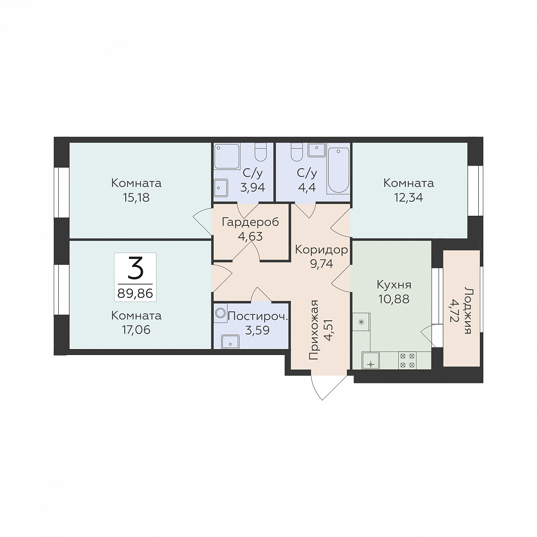 3-комнатная квартира, 89.86 м2, 2 этаж, №78, Суворов сити 2