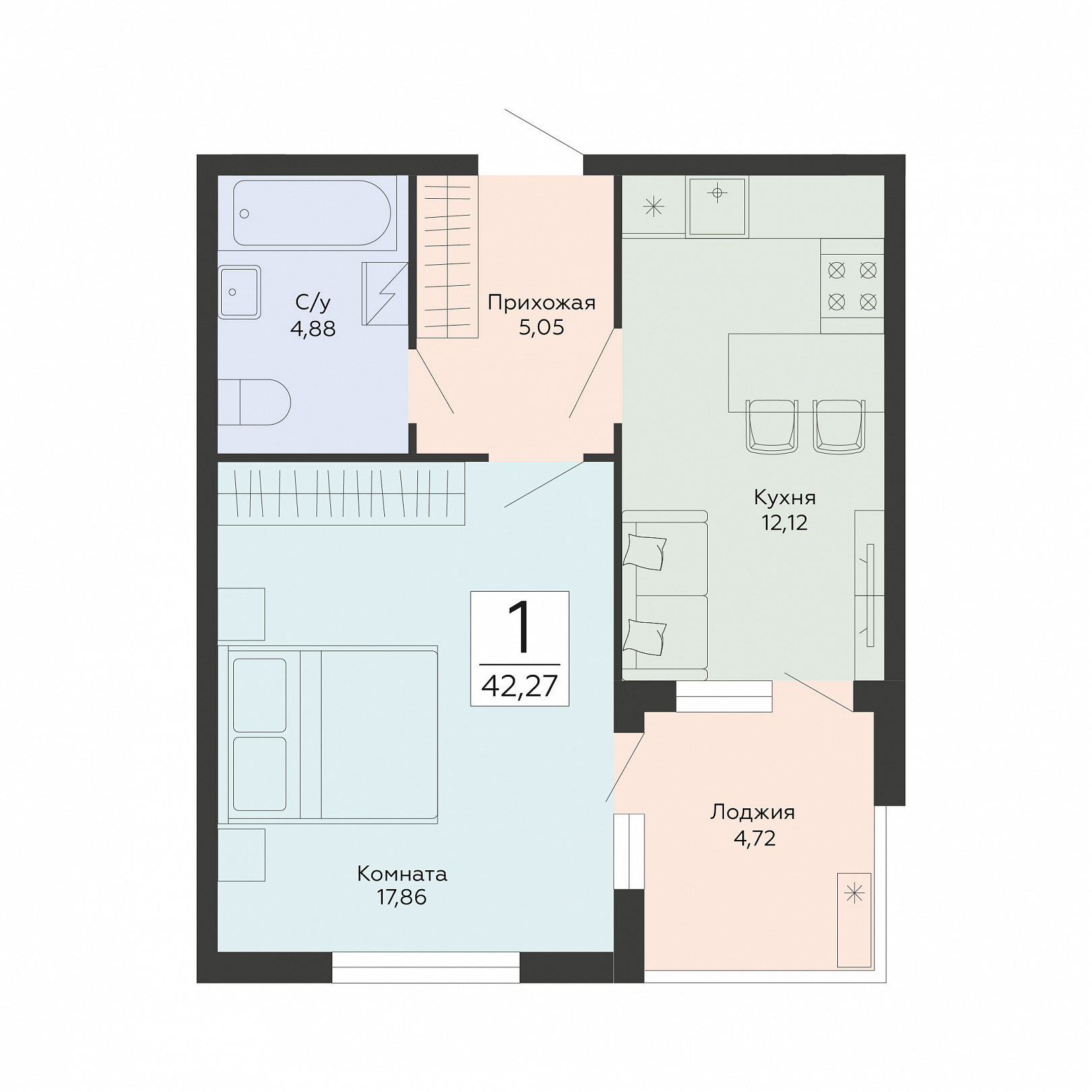 1-комнатная квартира, 42.27 м2, 8 этаж, №229, Мармелад