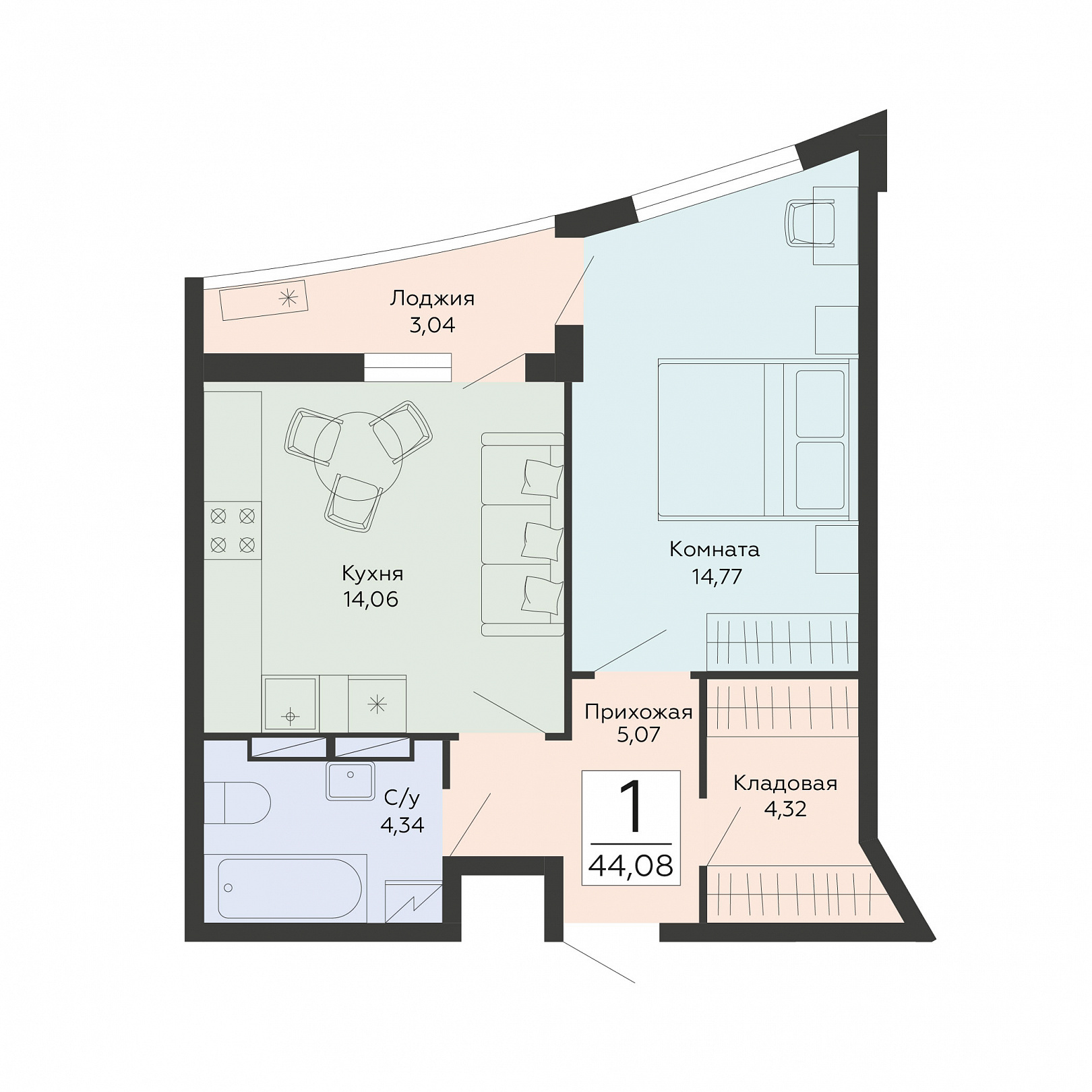 1-комнатная квартира, 44.08 м2, 6 этаж, №201, Мармелад