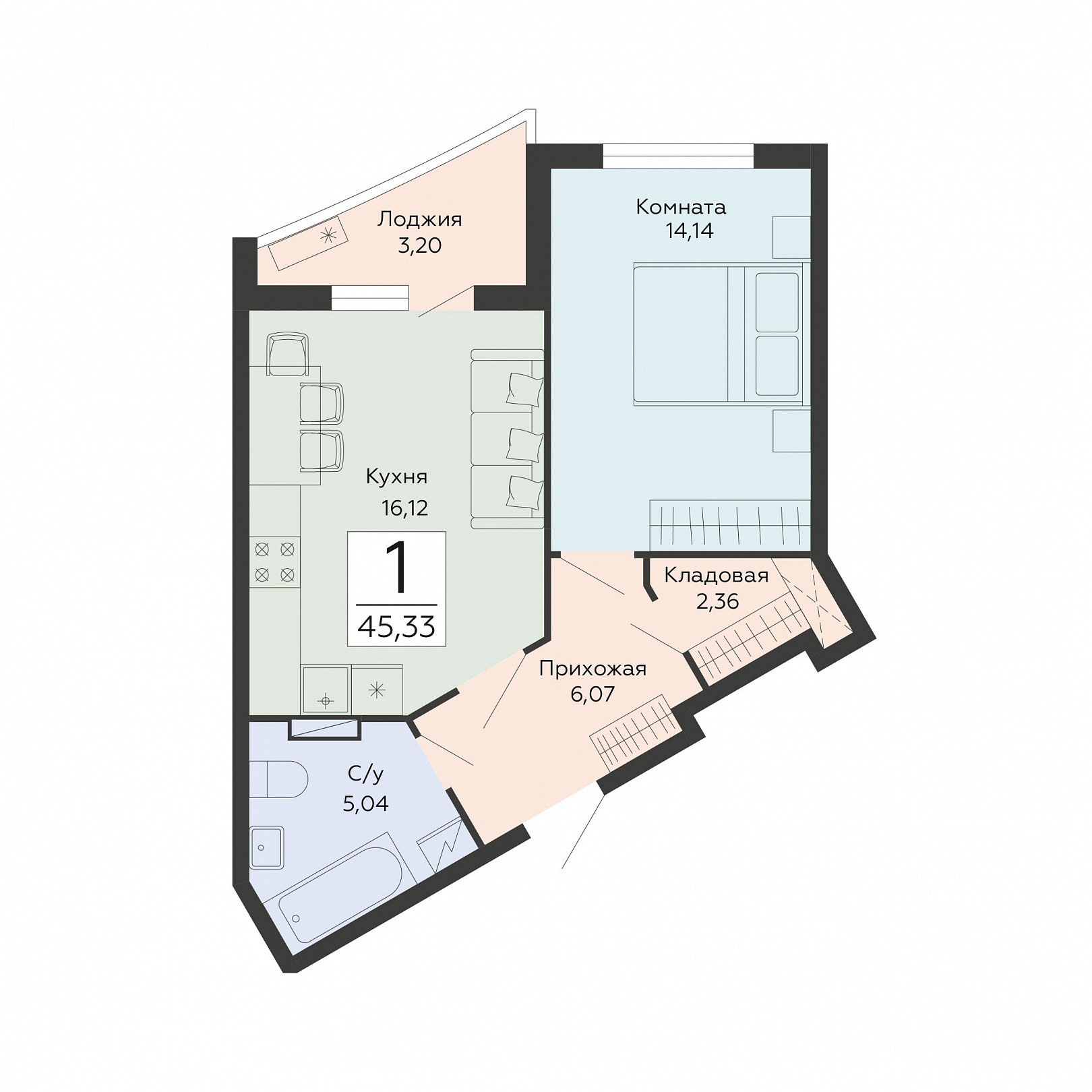 1-комнатная квартира, 45.33 м2, 2 этаж, №158, Мармелад