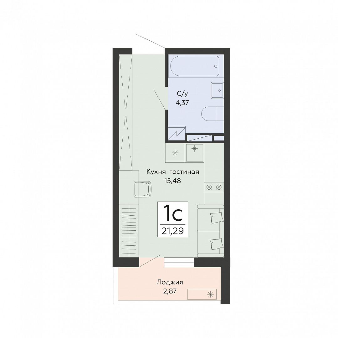 1-комнатная (студия), 21.29 м2, 2 этаж, №164, Мармелад