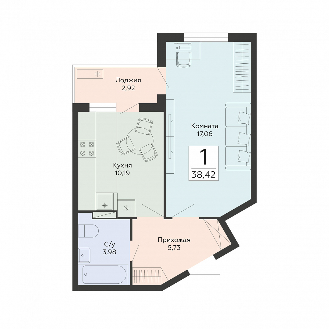 1-комнатная квартира, 38.42 м2, 8 этаж, №370, Мармелад