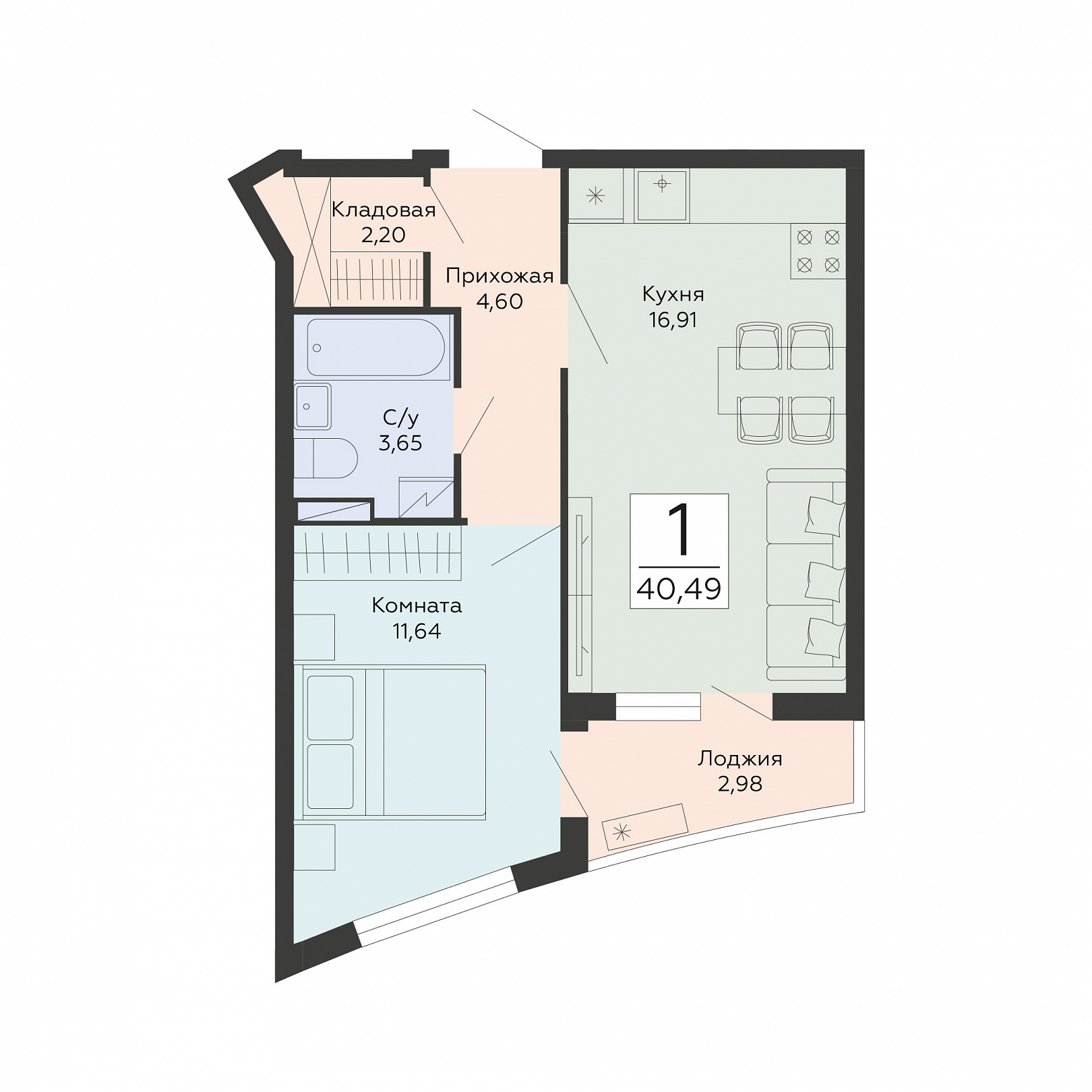 1-комнатная квартира, 40.49 м2, 9 этаж, №377, Мармелад
