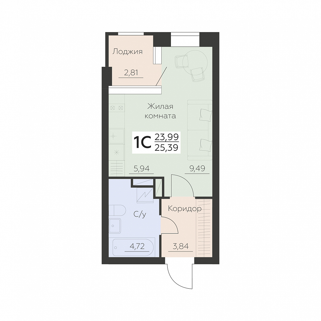 1-комнатная (студия), 25.39 м2, 4 этаж, №523, Заря