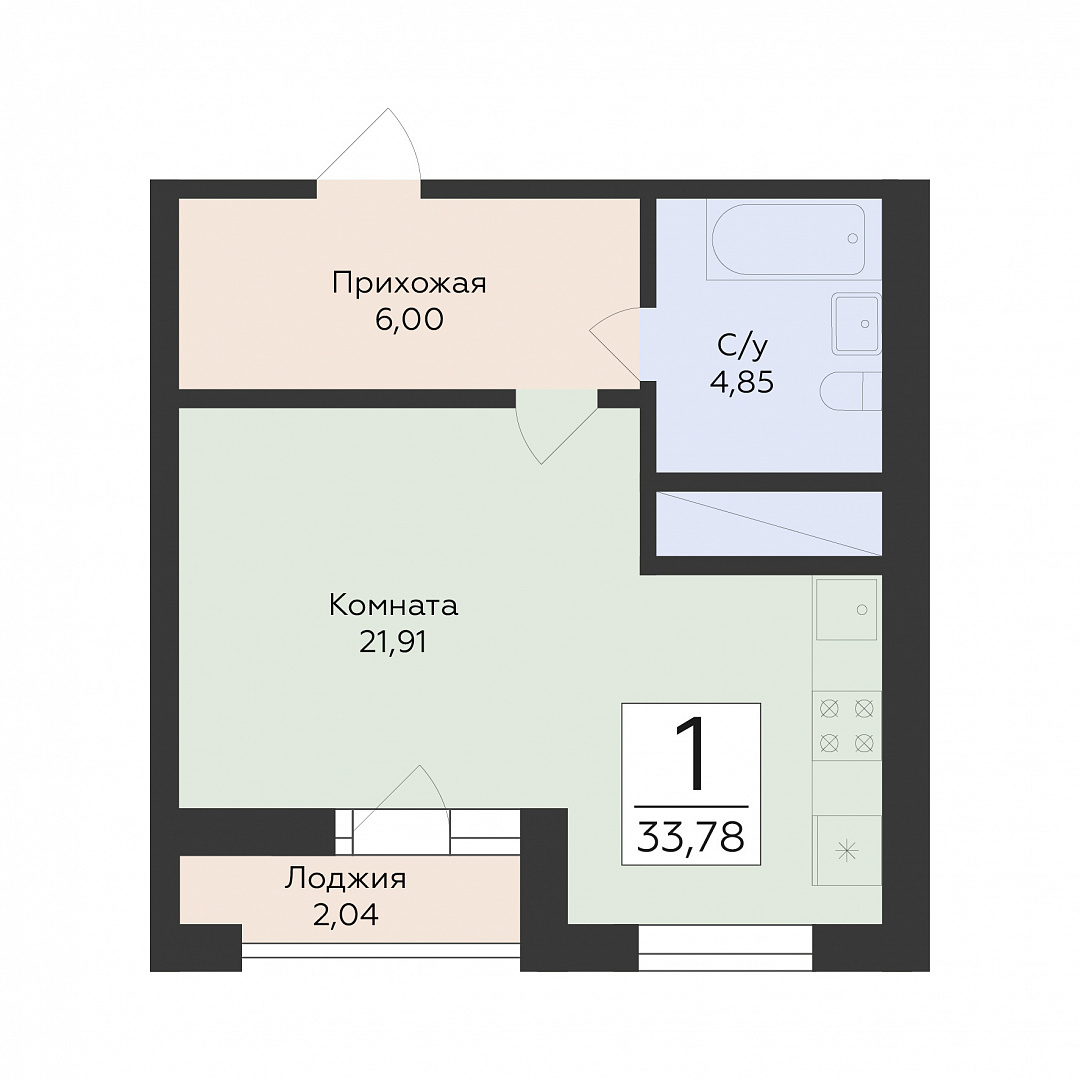 1-комнатная (студия), 33.78 м2, 9 этаж, №428, Юность