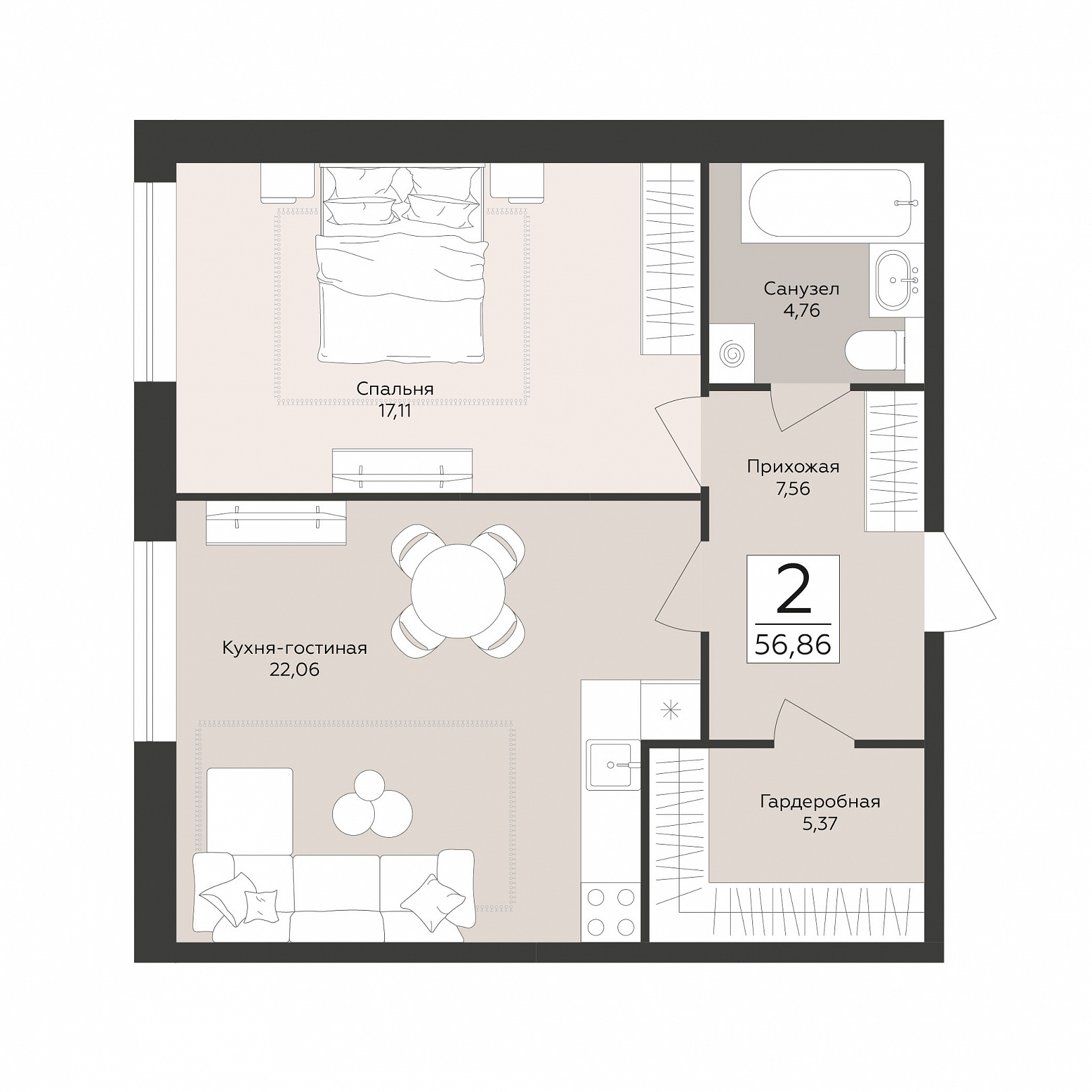 1-комнатная квартира, 56.86 м2, 1 этаж, №115, Эклипс