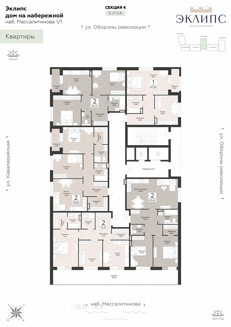 1-комнатная квартира, 47.85 м2, 6 этаж, №138, Эклипс