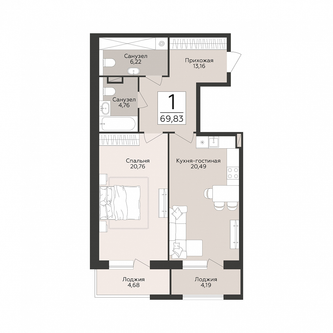 1-комнатная квартира, 69.83 м2, 2 этаж, №8, Эклипс