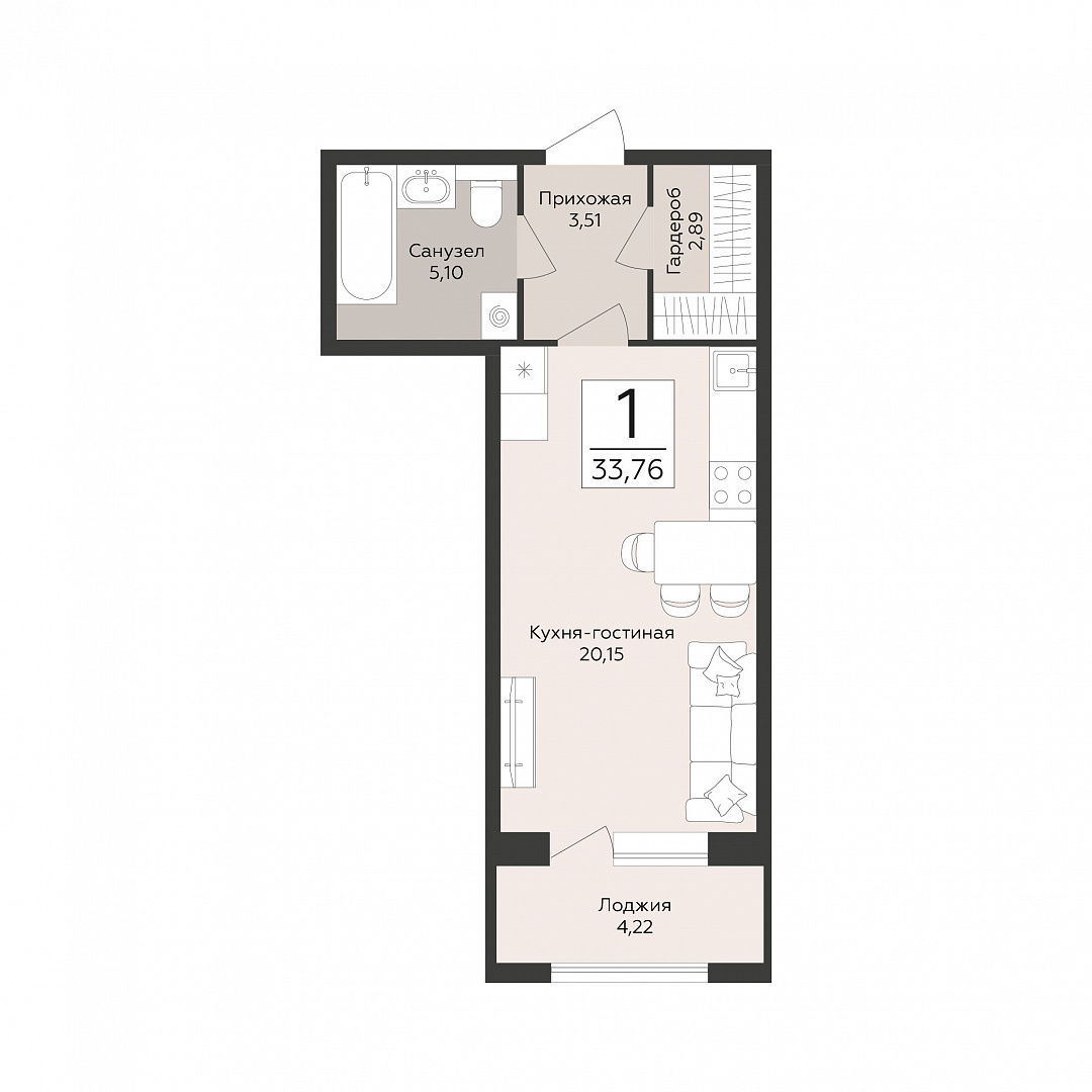 1-комнатная (студия), 33.76 м2, 4 этаж, №19, Эклипс