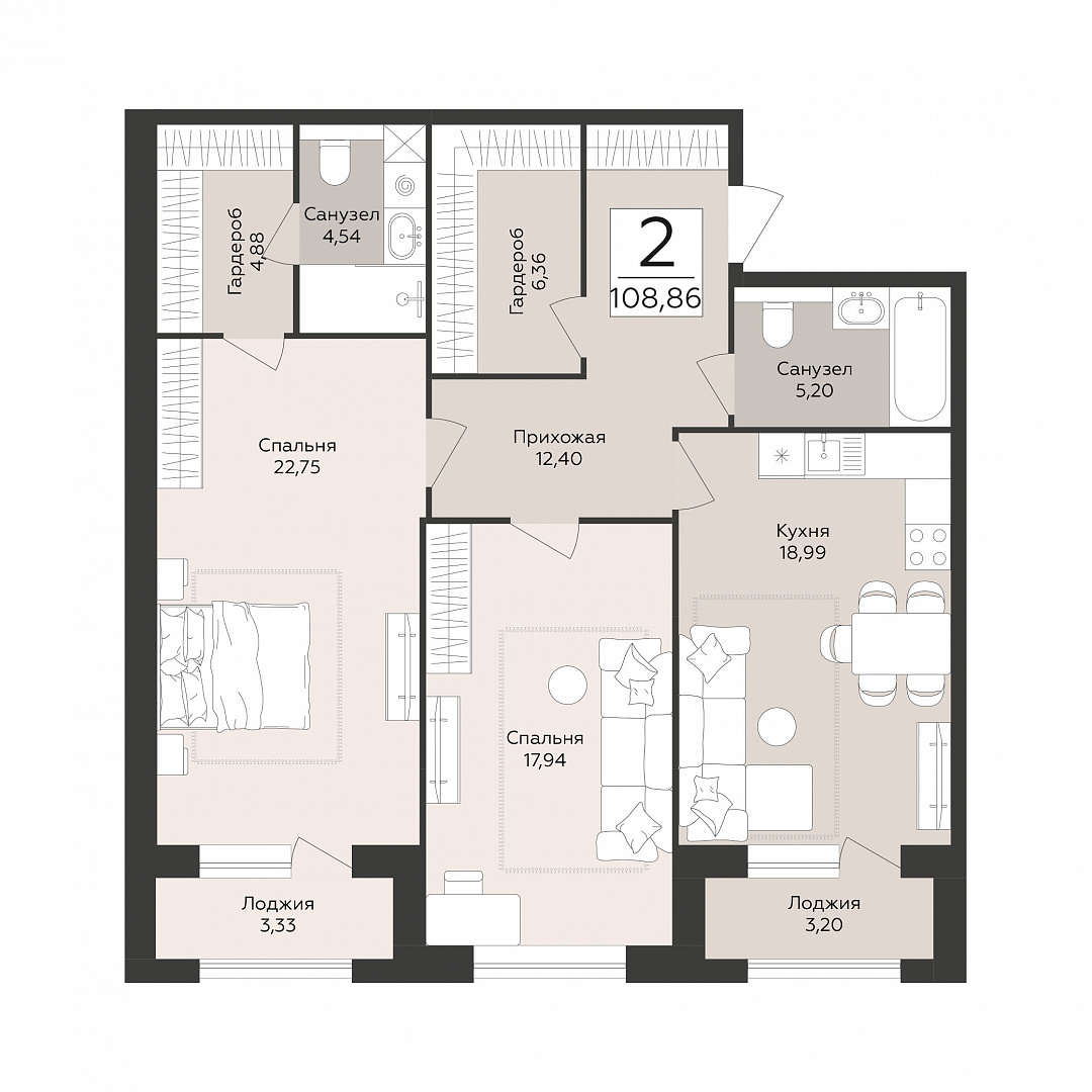 2-комнатная квартира, 108.86 м2, 1 этаж, №114, Эклипс