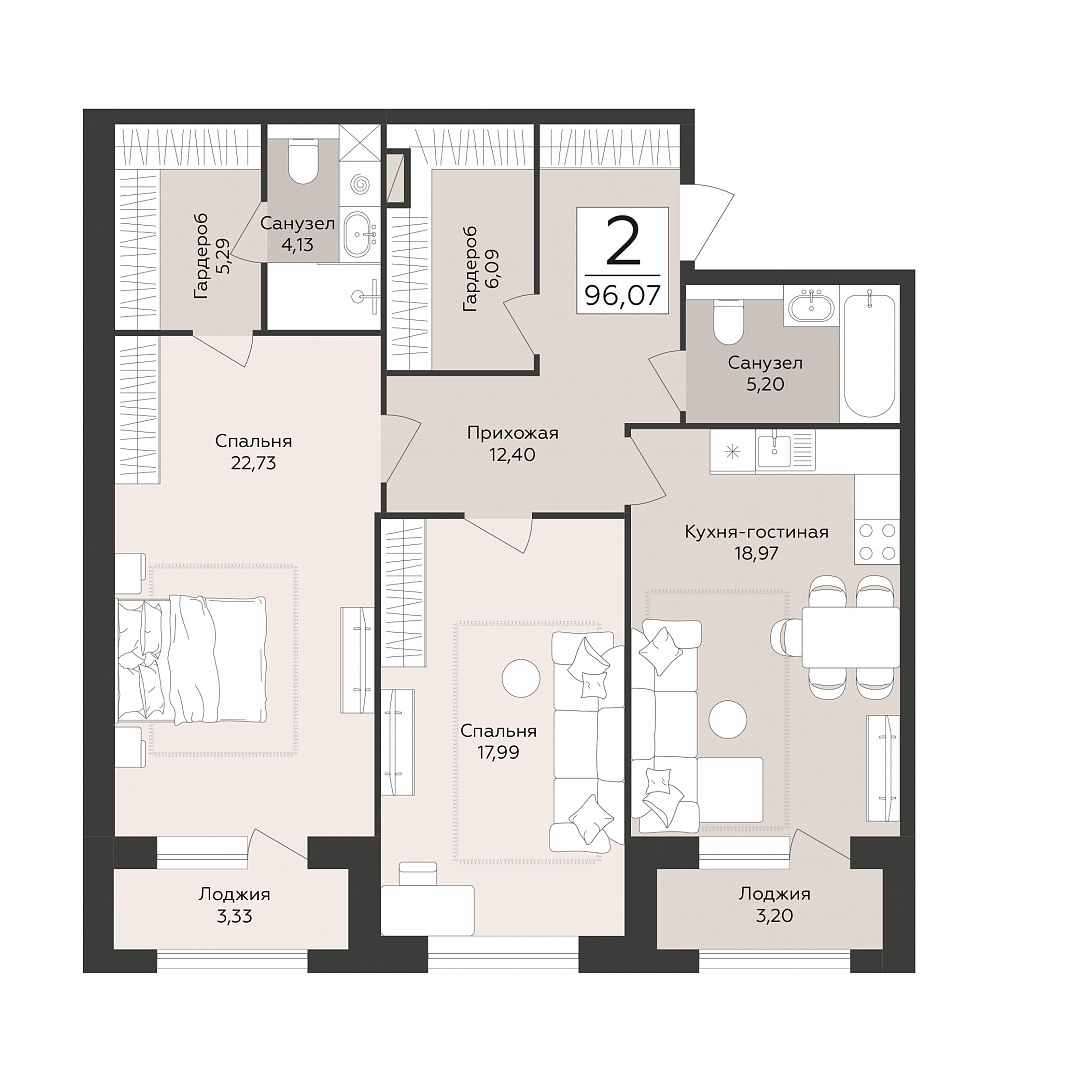 2-комнатная квартира, 96.07 м2, 2 этаж, №117, Эклипс