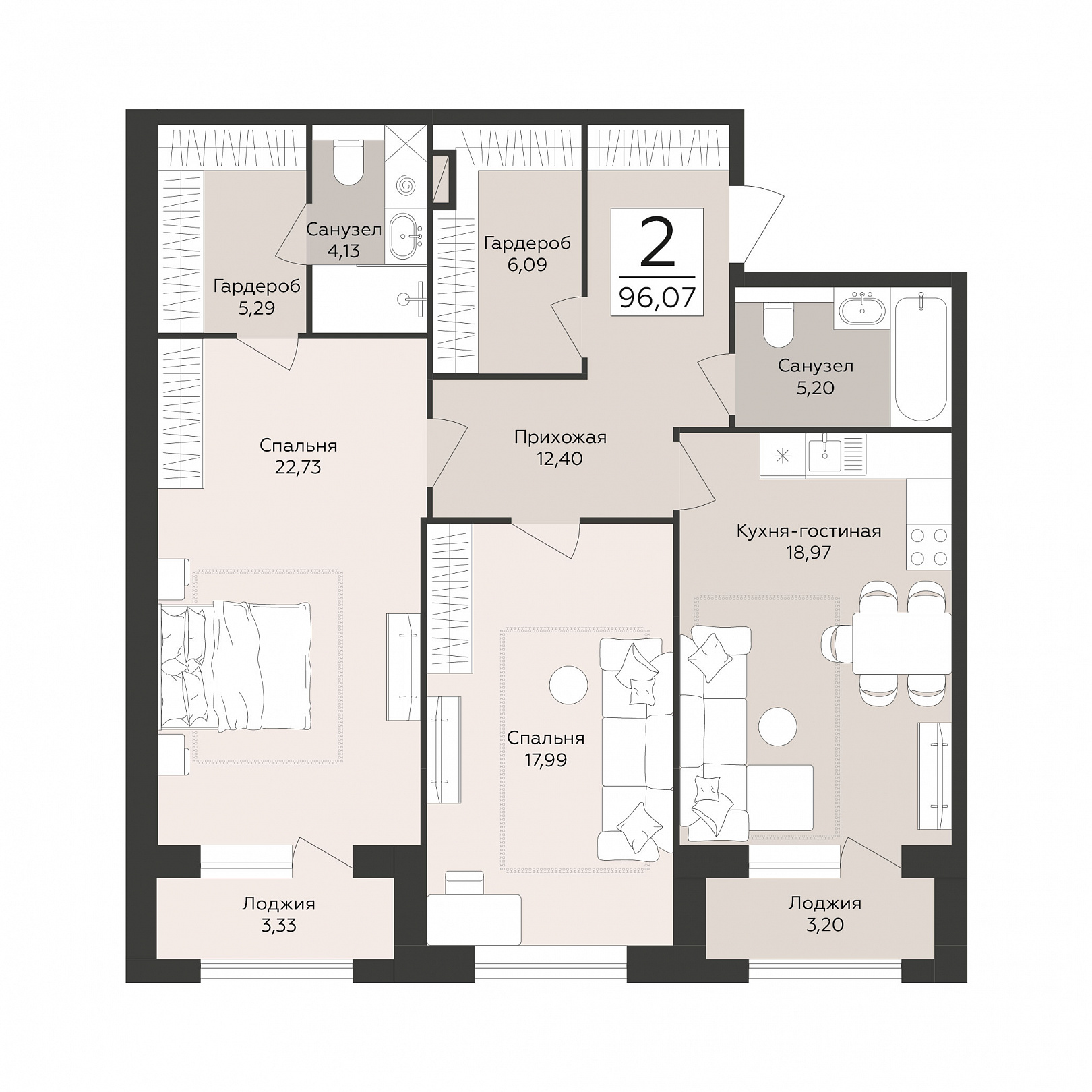 2-комнатная квартира, 96.07 м2, 4 этаж, №125, Эклипс