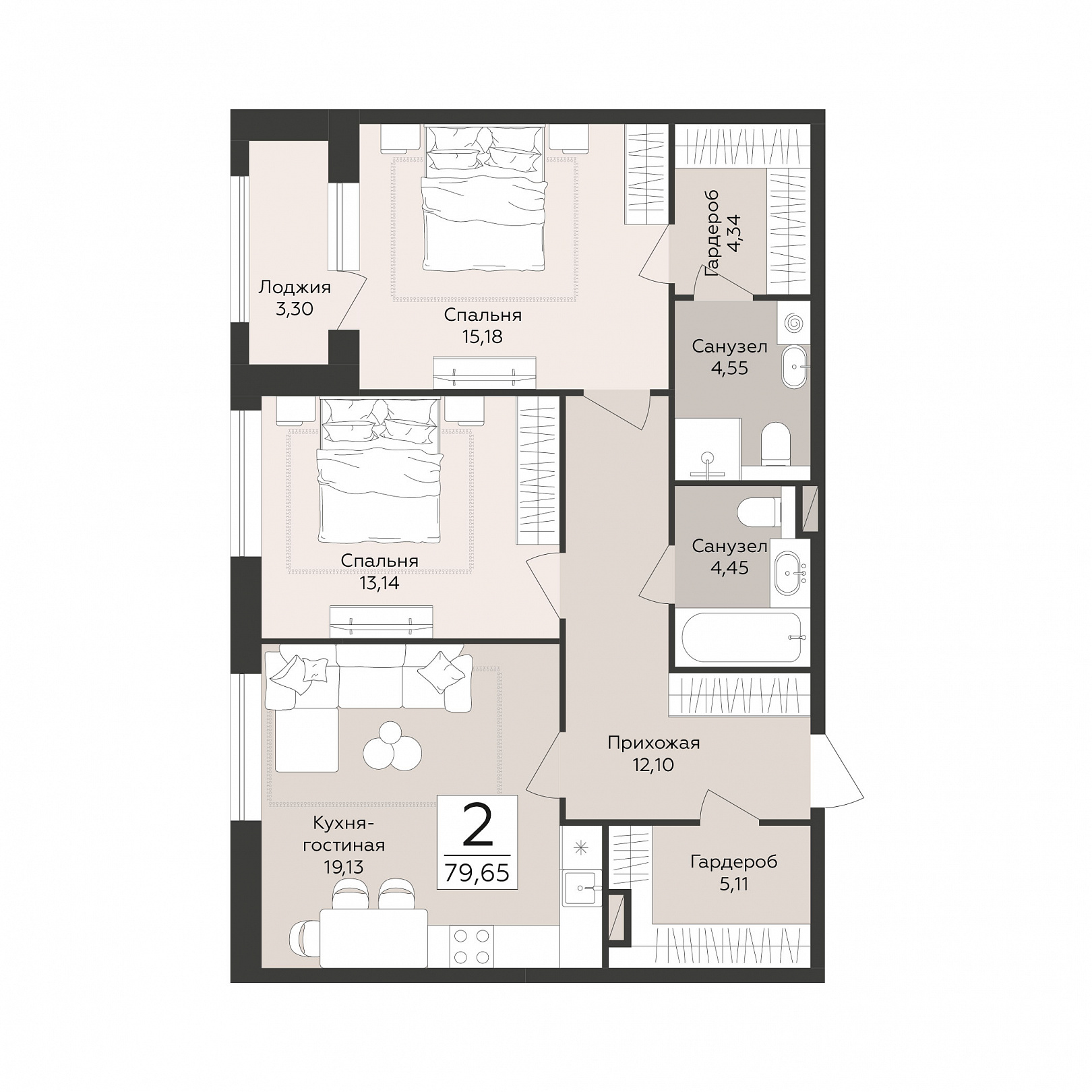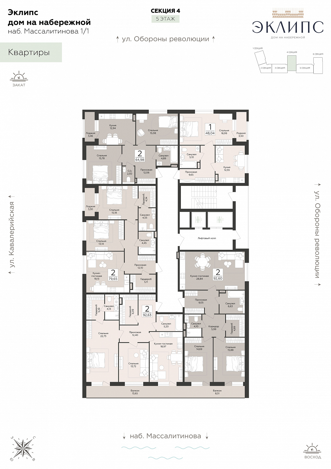 2-комнатная квартира, 79.65 м2, 5 этаж, №131, Эклипс
