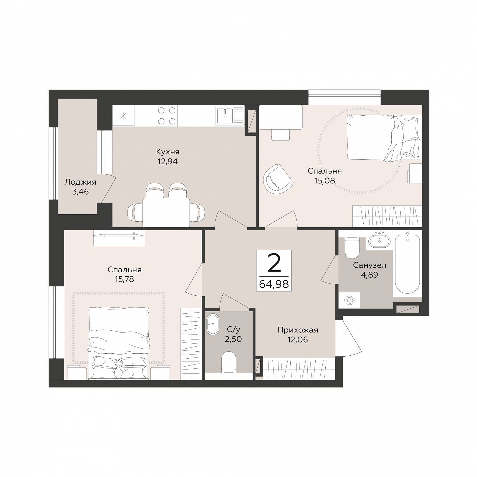 2-комнатная квартира, 64.98 м2, 5 этаж, №132, Эклипс