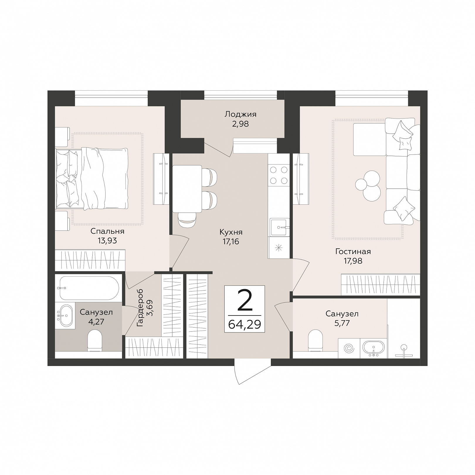 2-комнатная квартира, 64.29 м2, 1 этаж, №73, Эклипс