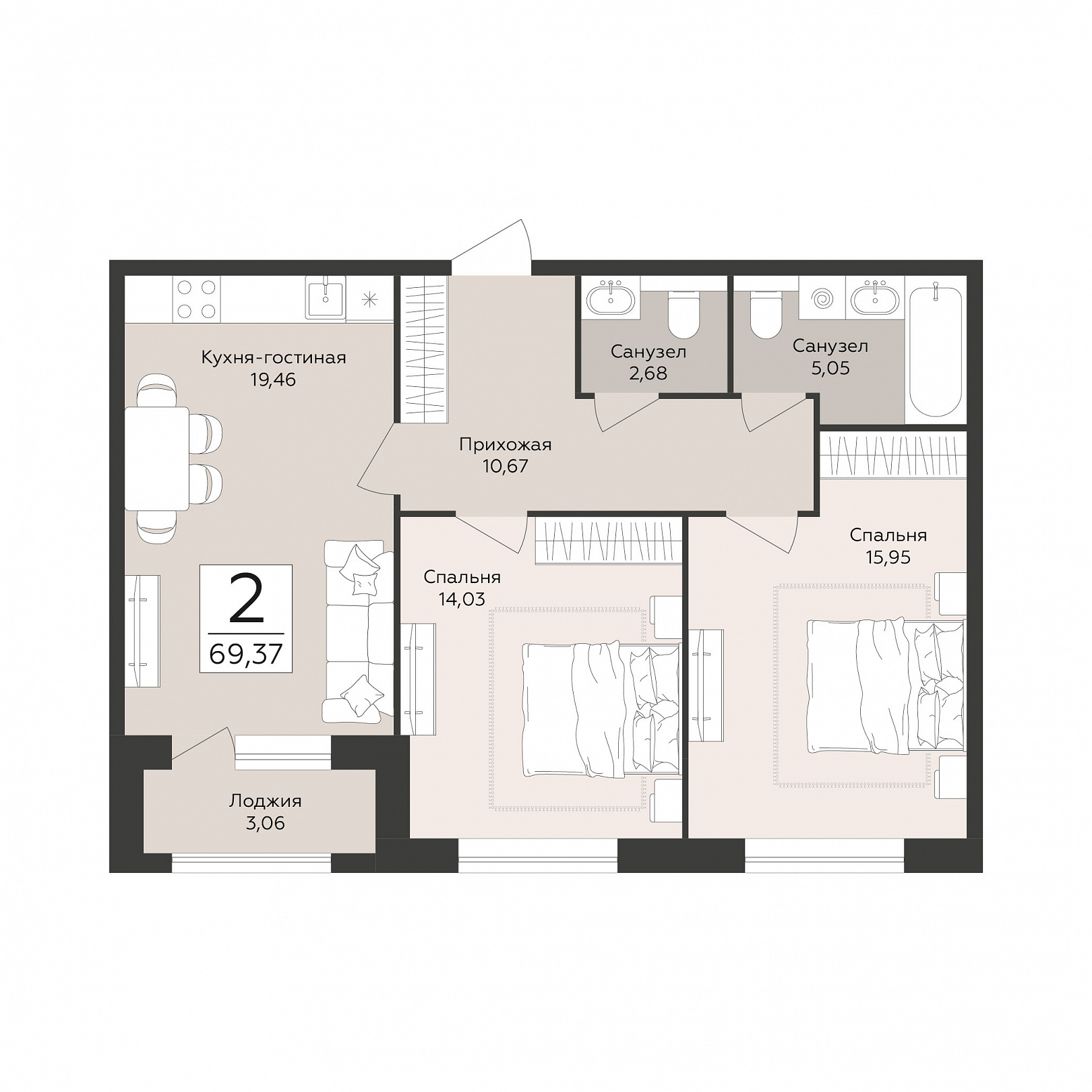 2-комнатная квартира, 69.37 м2, 1 этаж, №77, Эклипс