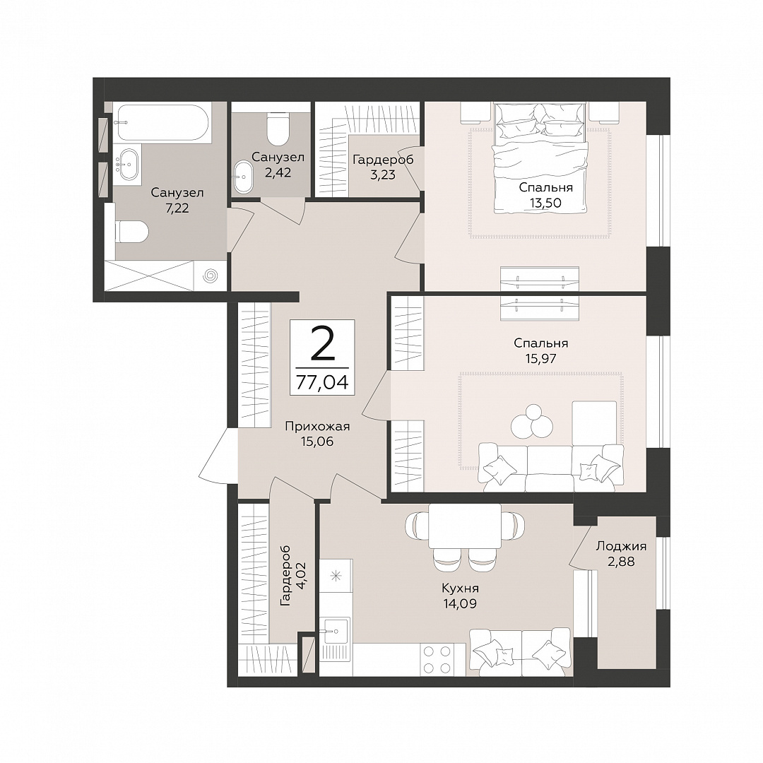 2-комнатная квартира, 77.04 м2, 2 этаж, №10, Эклипс
