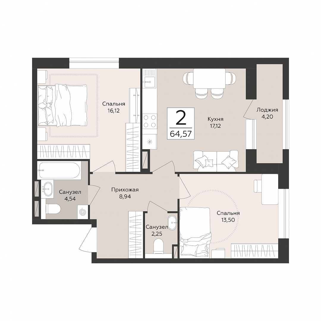 2-комнатная квартира, 64.57 м2, 4 этаж, №23, Эклипс