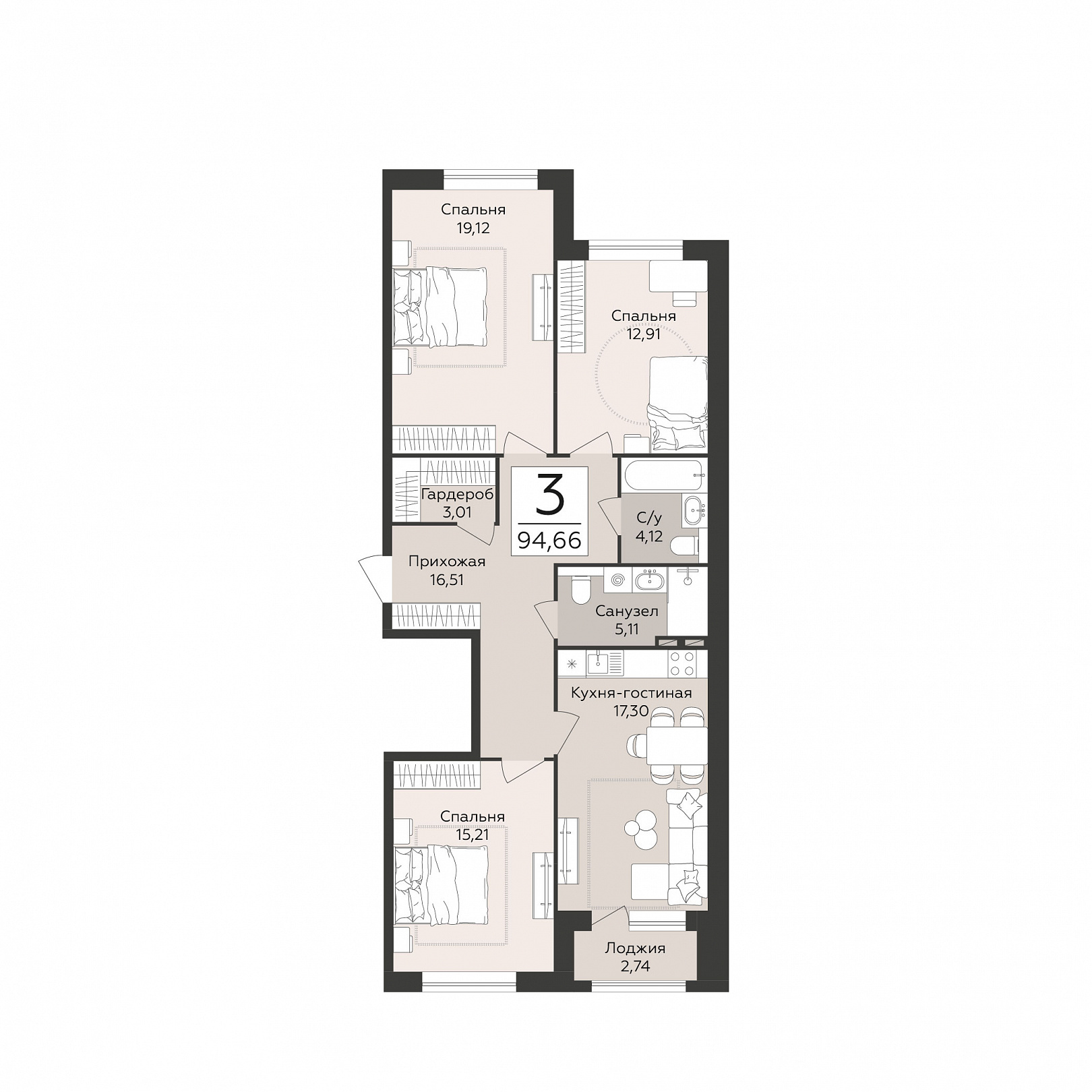 3-комнатная квартира, 94.66 м2, 4 этаж, №95, Эклипс