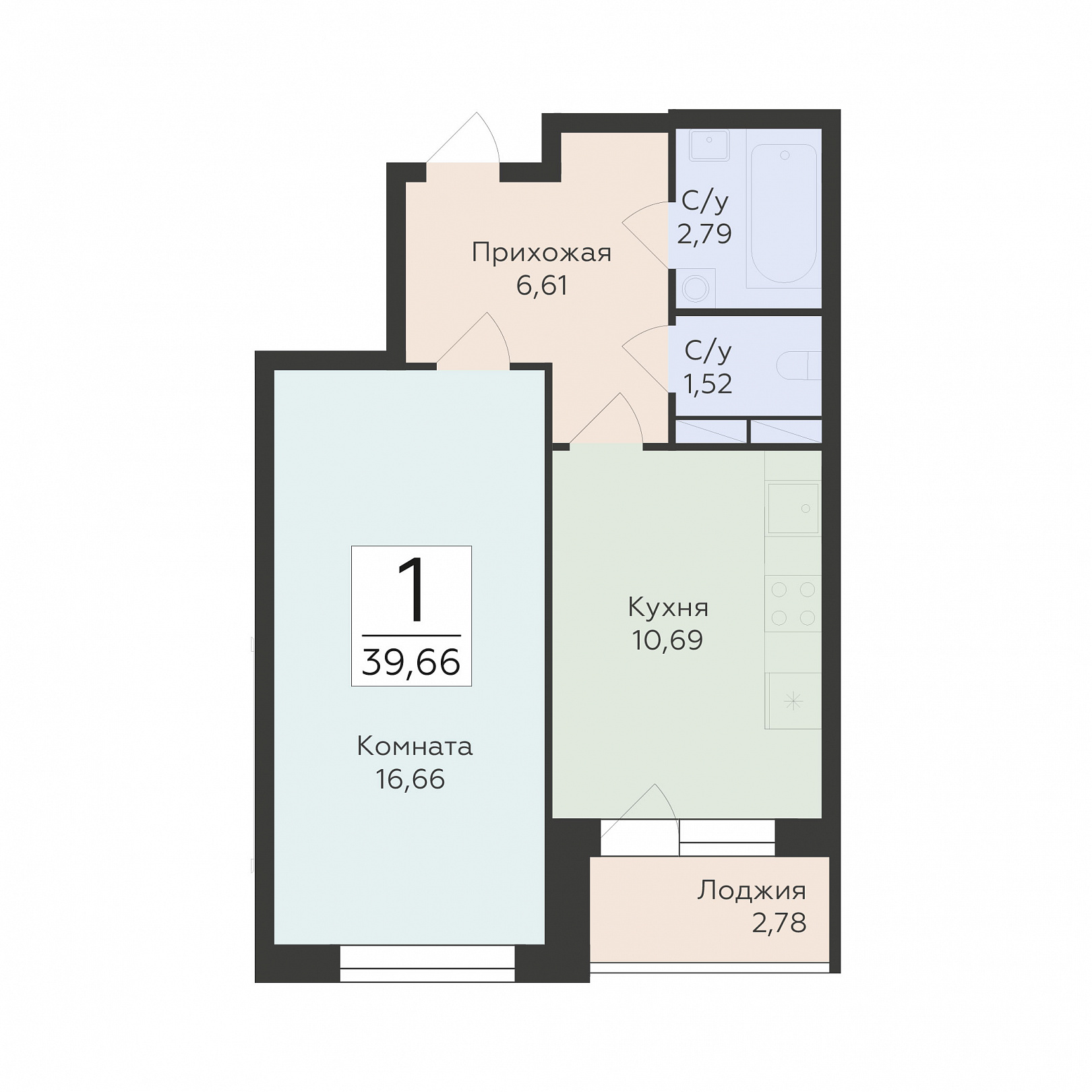 1-комнатная квартира, 39.66 м2, 15 этаж, №261, Авиапарк