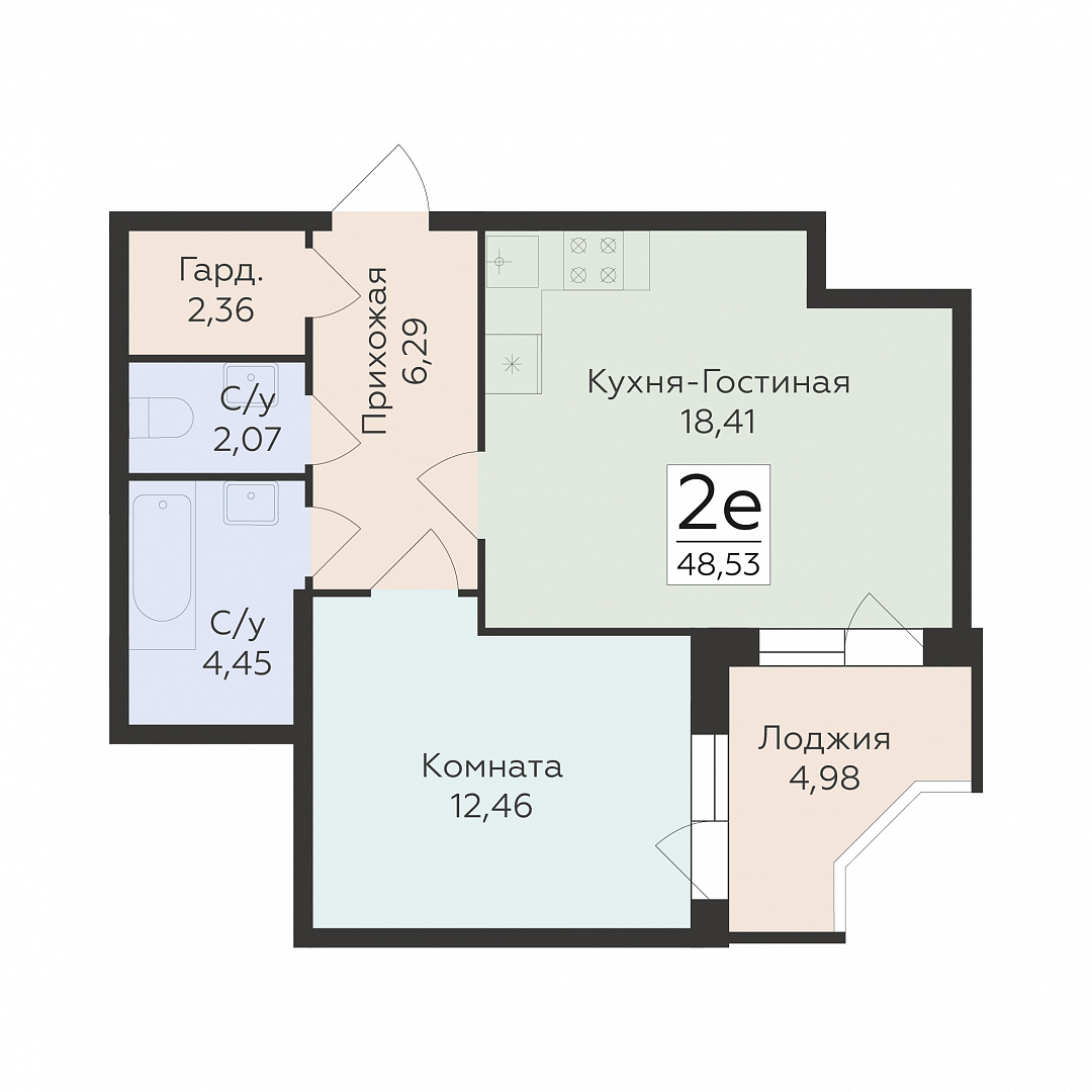 2-ком. квартира (Евро), 48.53 м2, 11 этаж, №124, Авиапарк