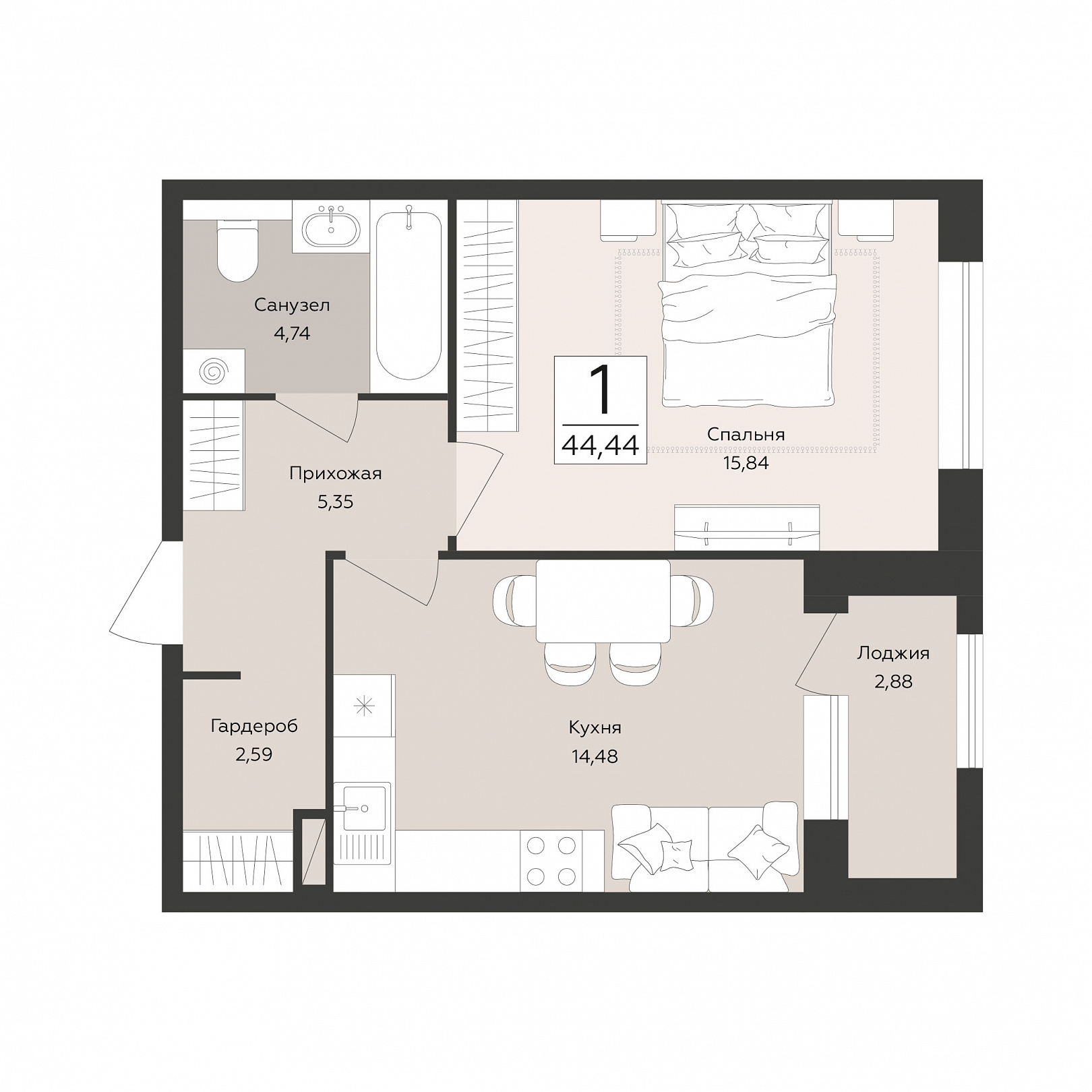 1-комнатная квартира, 44.44 м2, 3 этаж, №17, Эклипс