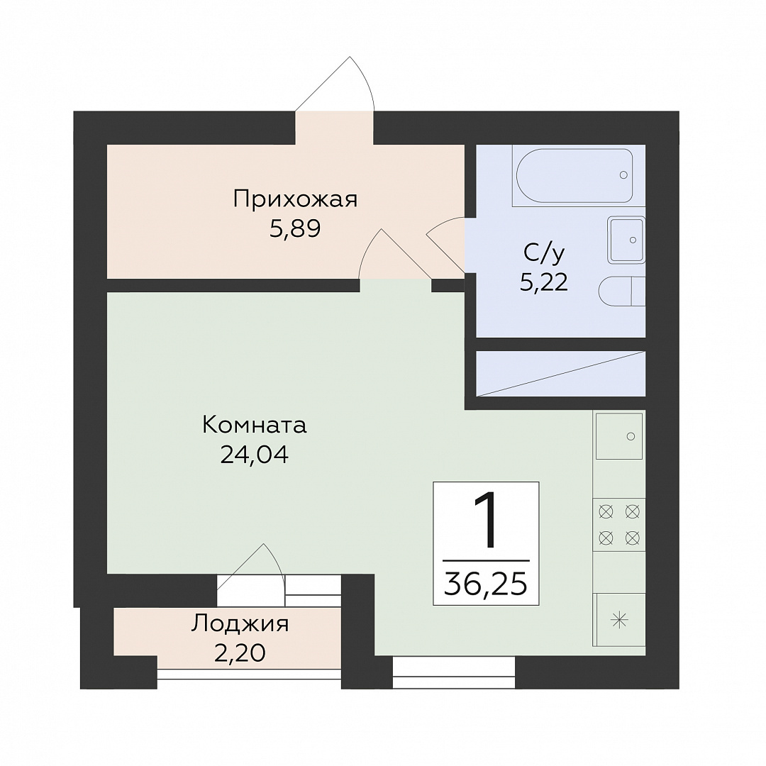 1-комнатная (студия), 36.25 м2, 11 этаж, №223, Юность