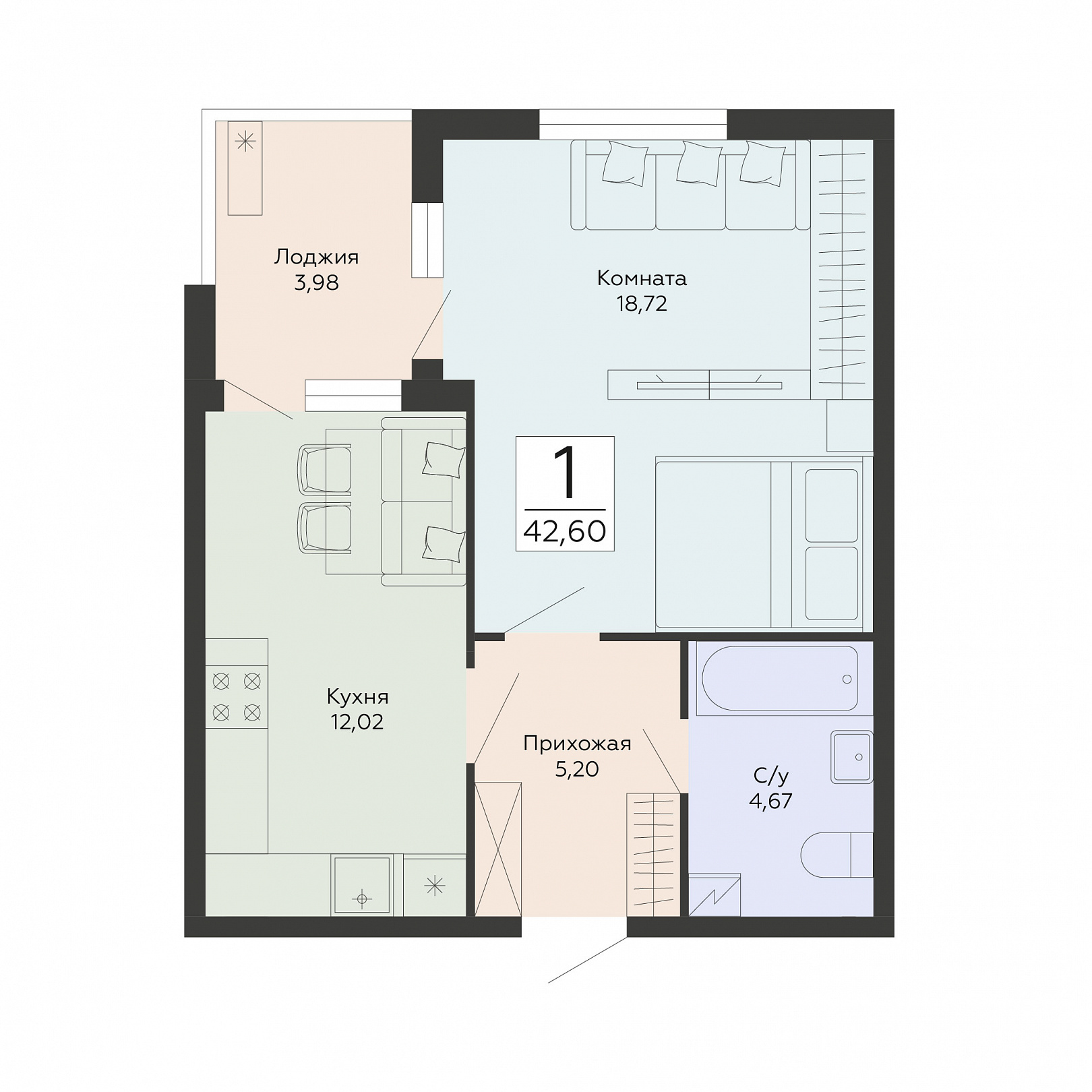 1-комнатная квартира, 42.6 м2, 4 этаж, №39, Мармелад