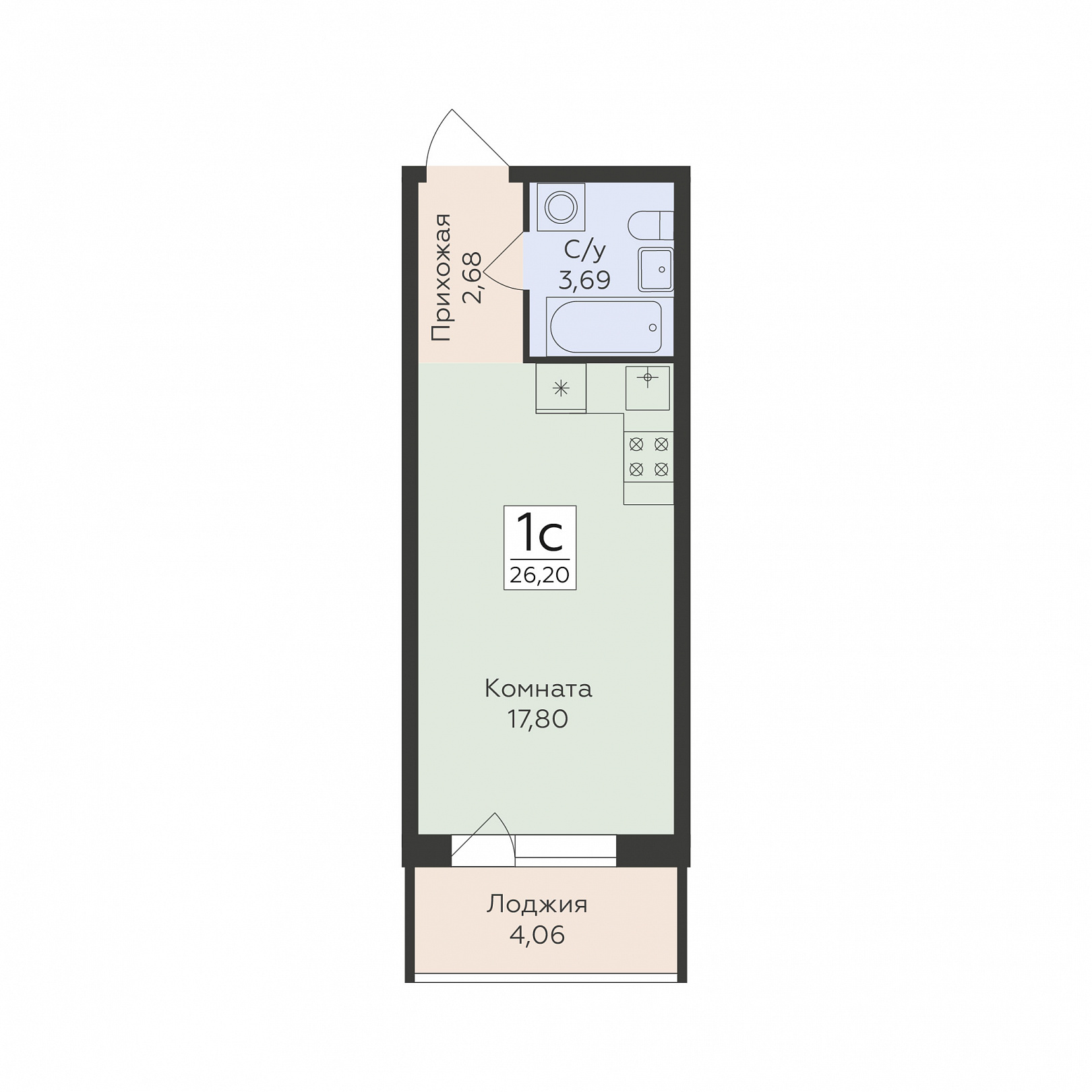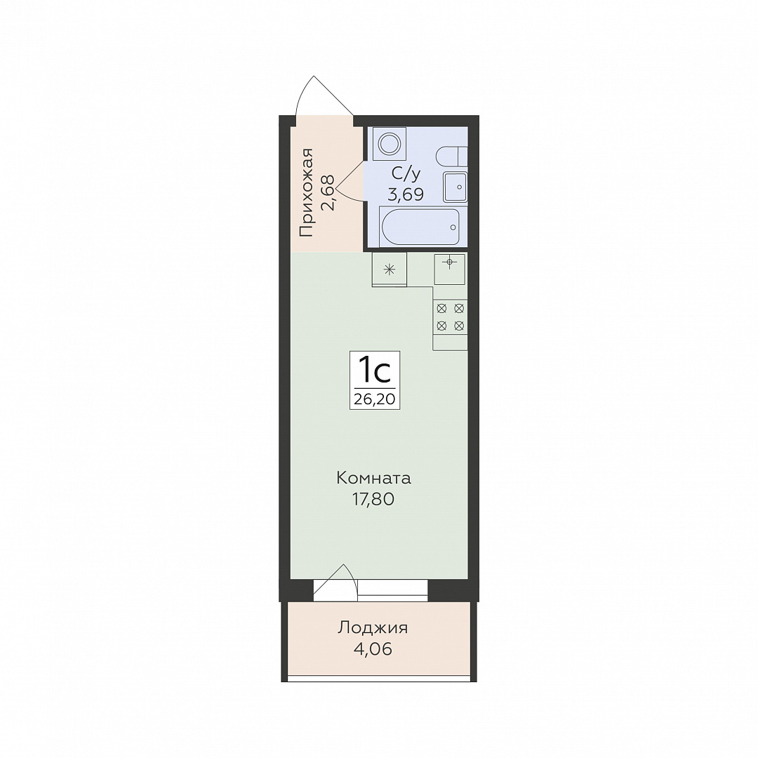 1-комнатная (студия), 26.2 м2, 2 этаж, №4, Flora