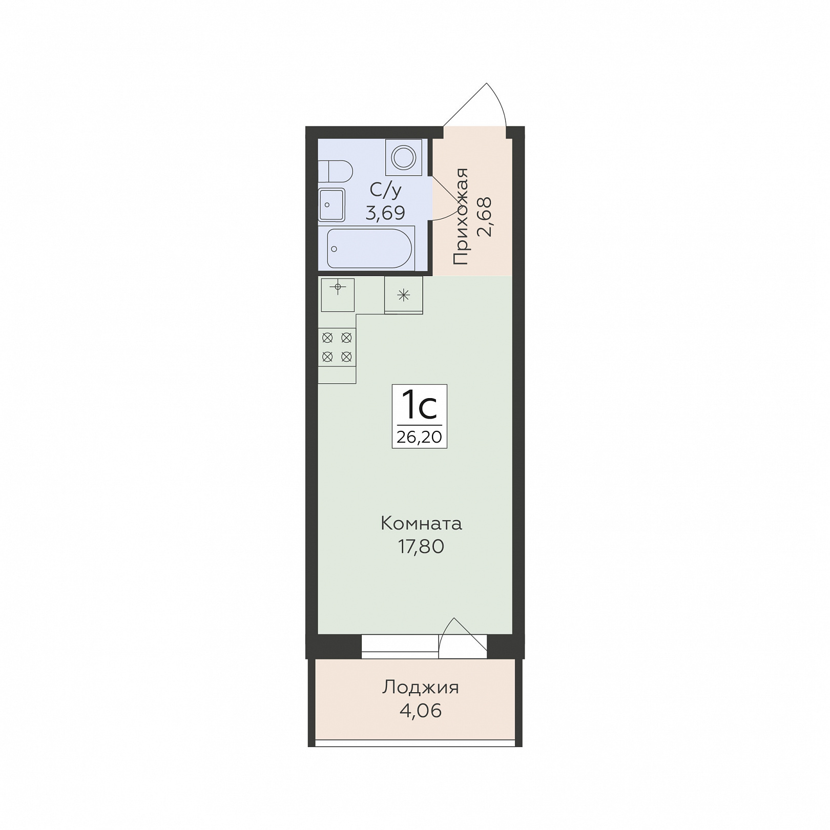 1-комнатная (студия), 26.2 м2, 2 этаж, №6, Flora