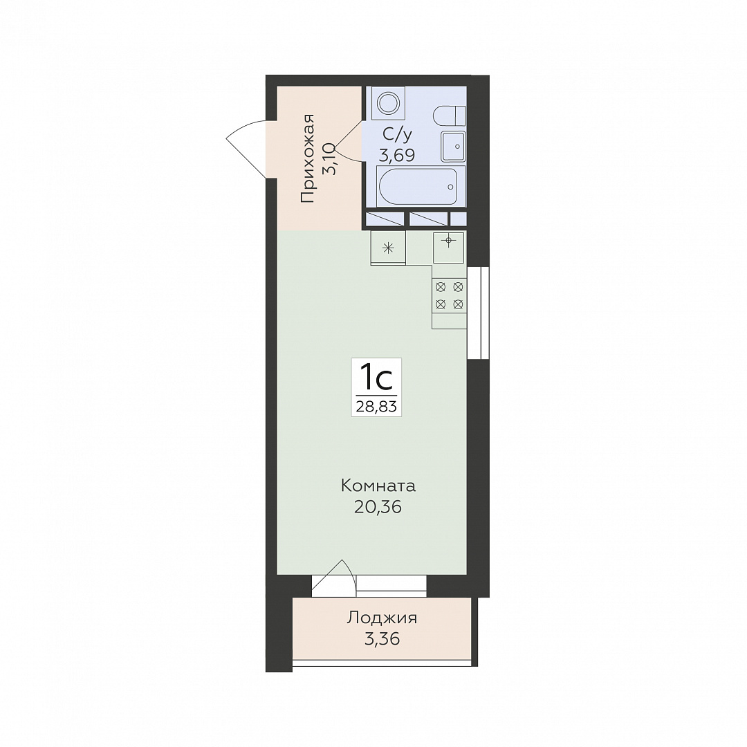 1-комнатная (студия), 28.83 м2, 4 этаж, №22, Flora