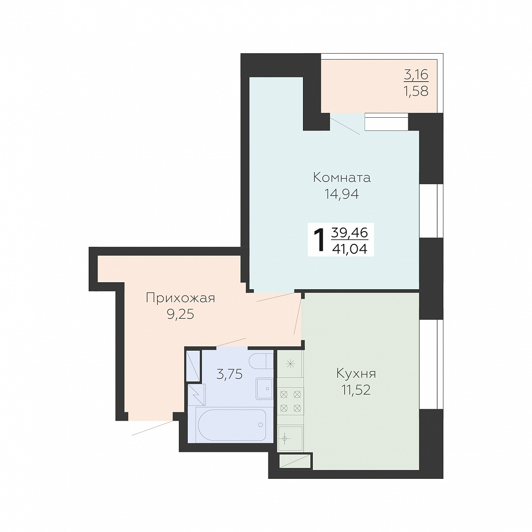 1-комнатная квартира, 41.04 м2, 12 этаж, №1 100, Зарядье