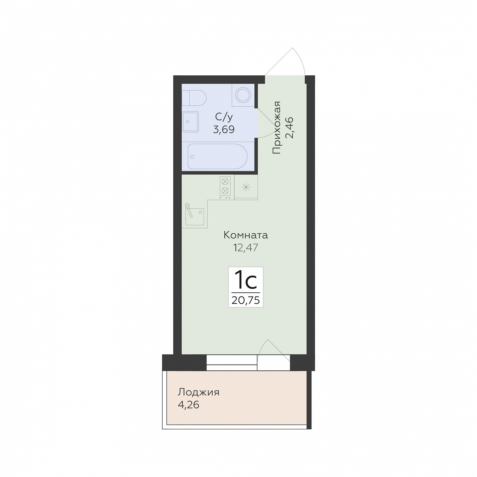 1-комнатная (студия), 20.75 м2, 13 этаж, №385, Flora