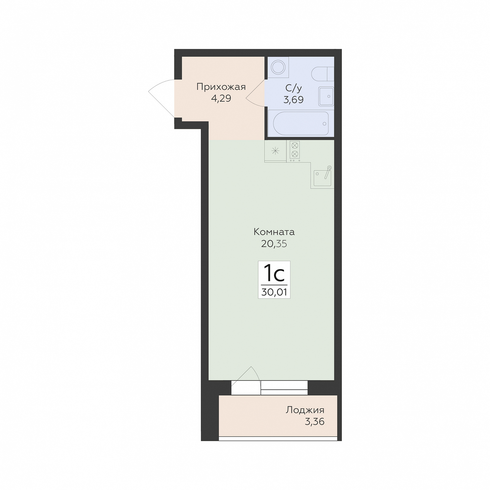 1-комнатная (студия), 30.01 м2, 5 этаж, №515, Flora